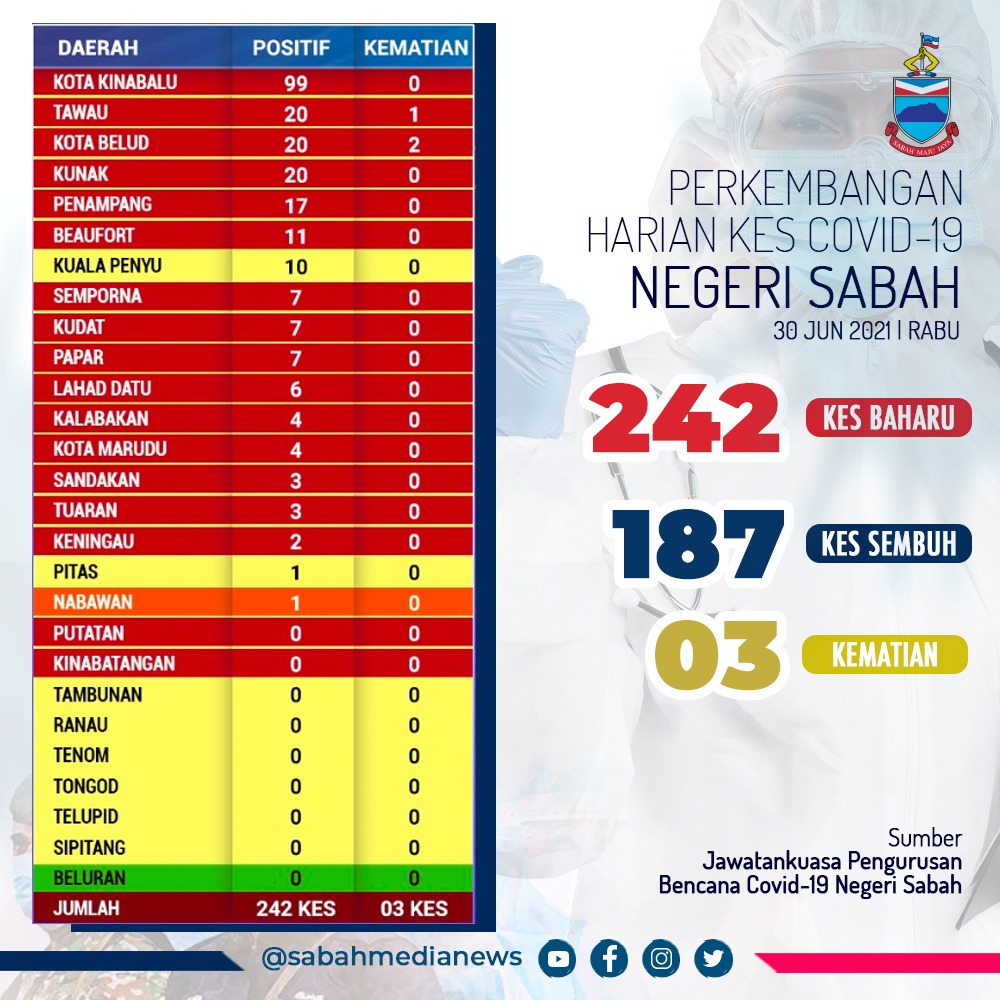 Menteri Kerajaan Tempatan dan Perumahan Sabah Datuk Seri Masidi Manjun berkata, Sabah turut merekodkan jumlah kes positif baharu yang tinggi sebanyak 242 kes berbanding 178 kes semalam.