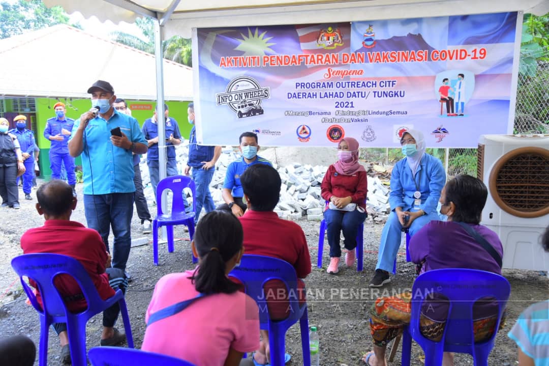 Program tersebut diselaraskan Jabatan Penerangan Daerah Lahad Datu dan Unit Pemimpin Pembangunan Masyarakat N.61 Segama dengan peruntukan 300 dos pertama vaksin Covid-19 jenis Pfizer.