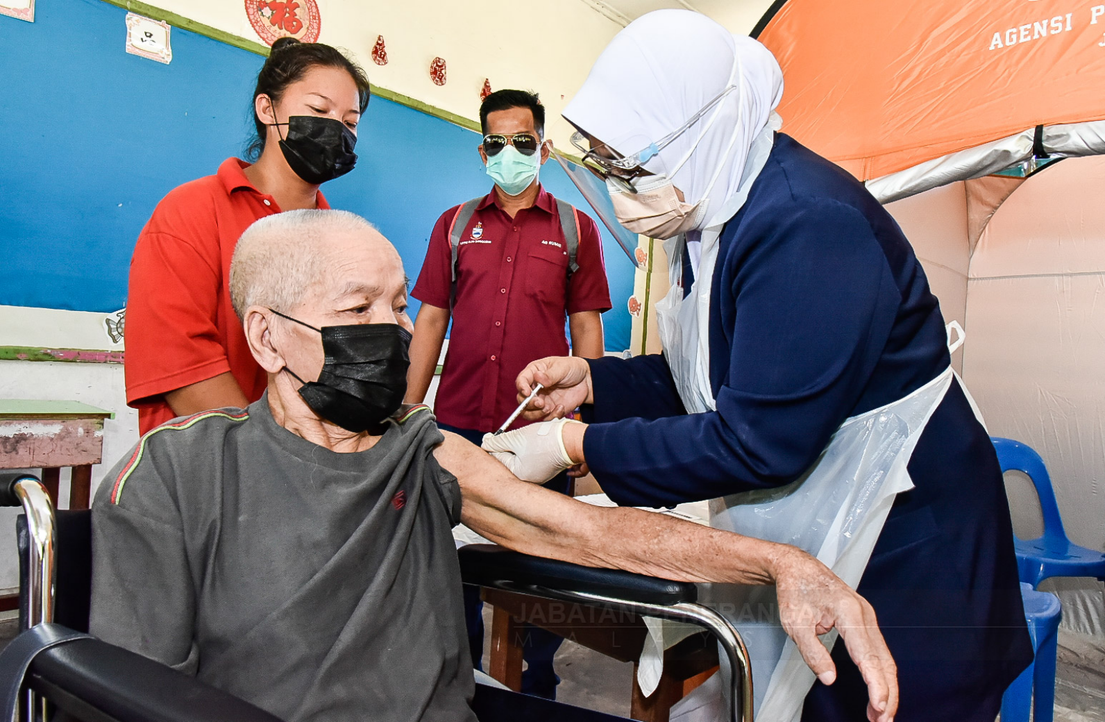 Turut mendapatkan vaksinasi tersebut ialah warga emas OKU, Bin Gat Tinggalung, 92, yang kehilangan kaki kanan akibat jangkitan kuman, diiring petugas Jabatan Sularelawan Malaysia (Rela) menggunakan kerusi roda.