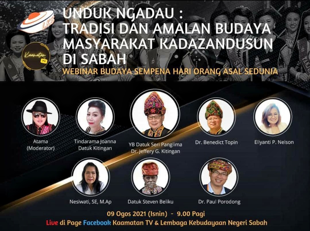 KOTA KINABALU: Satu webinar Unduk Ngadau diadakan sempena sambutan Hari Orang Asal Sedunia pada hari ini 9 Ogos 2021 anjuran bersama Lembaga Kebudayaan Negeri Sabah, Bahagian Warisan Sosio-Budaya KDCA, Majlis Wanita KDCA, Kaamatan TV dan Borneo Indigenous People Organisation (BIO) United Nation.