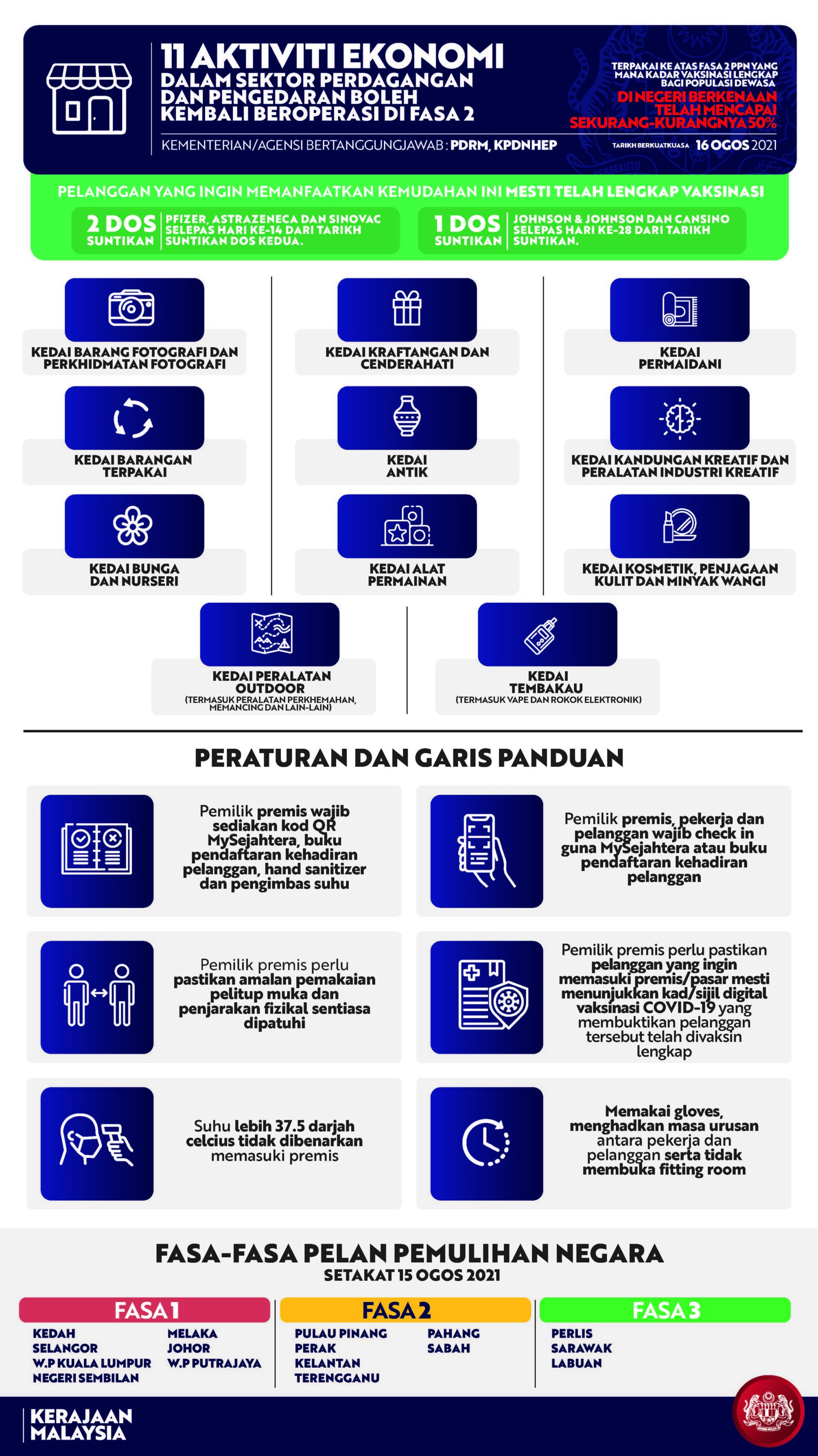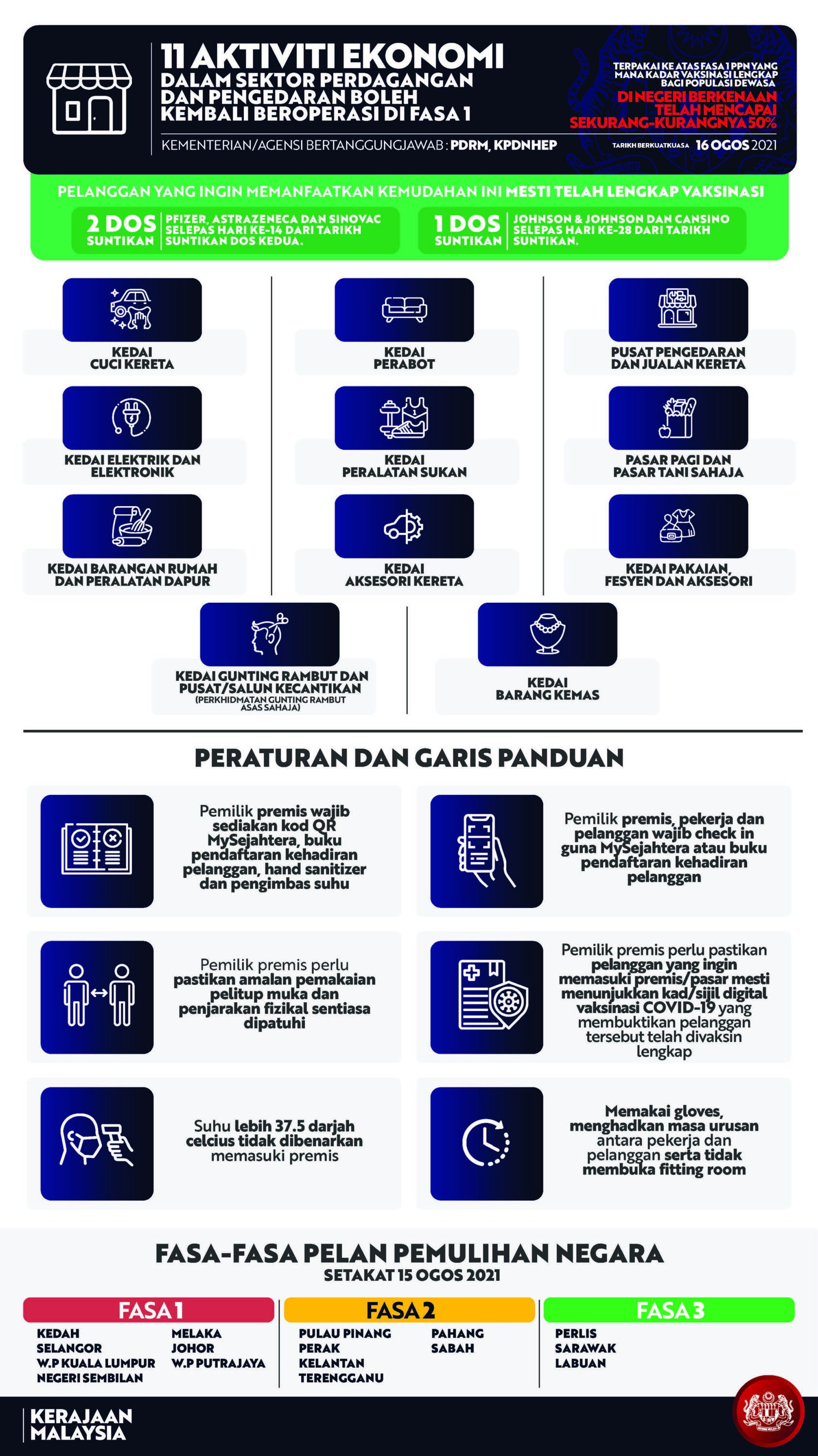 “Bagi kedai pakaian, fesyen dan aksesori; kedai barang kemas; serta kedai gunting rambut dan pusat atau salun kecantikan, terdapat prosedur operasi standard (SOP) kesihatan tambahan yang mesti dipatuhi.