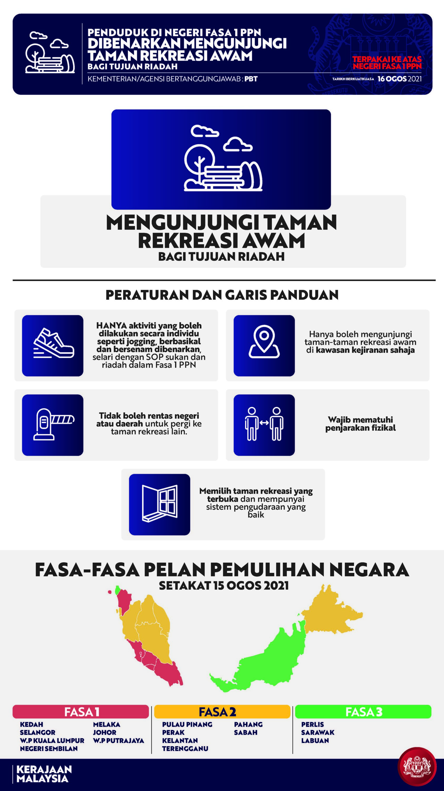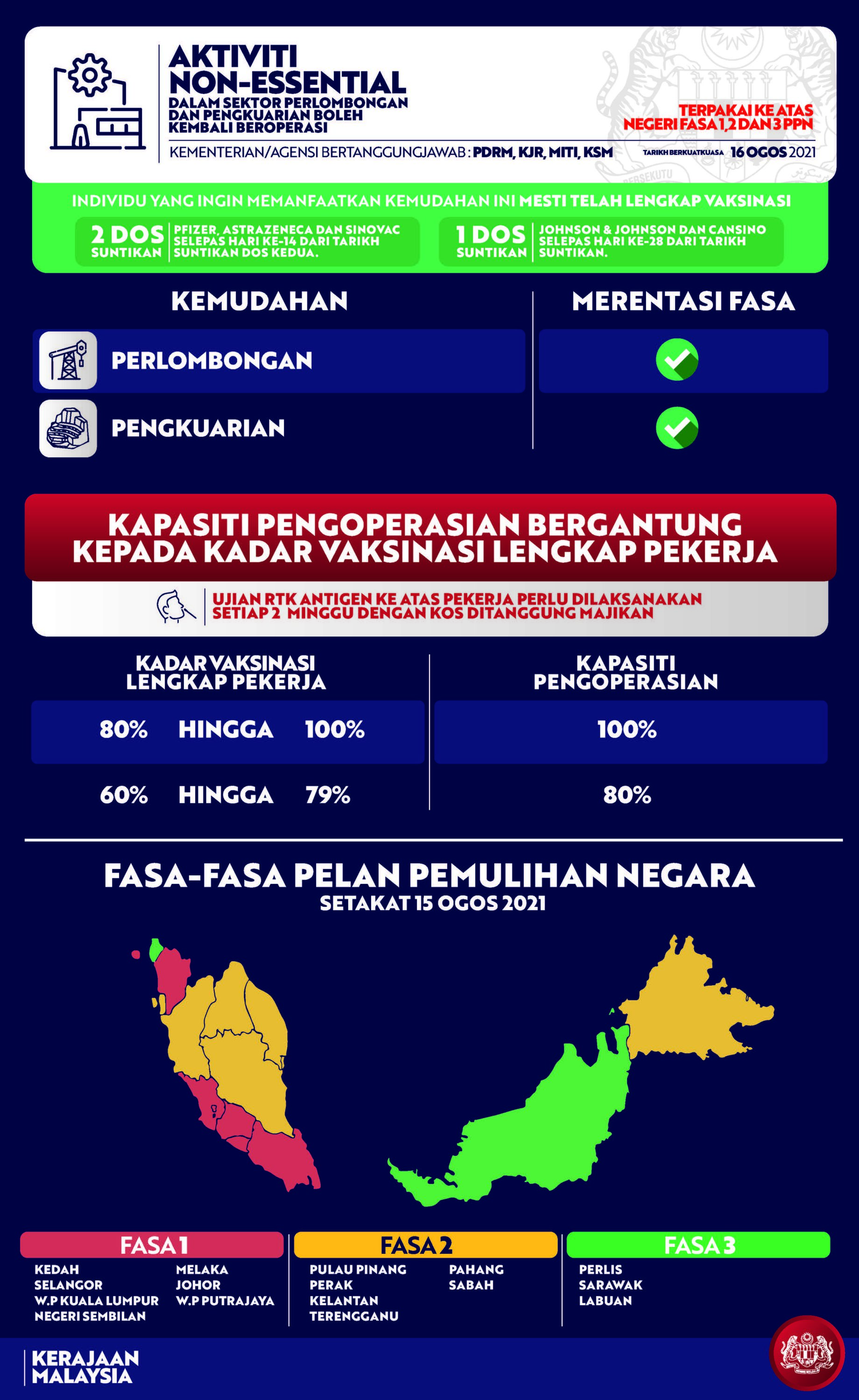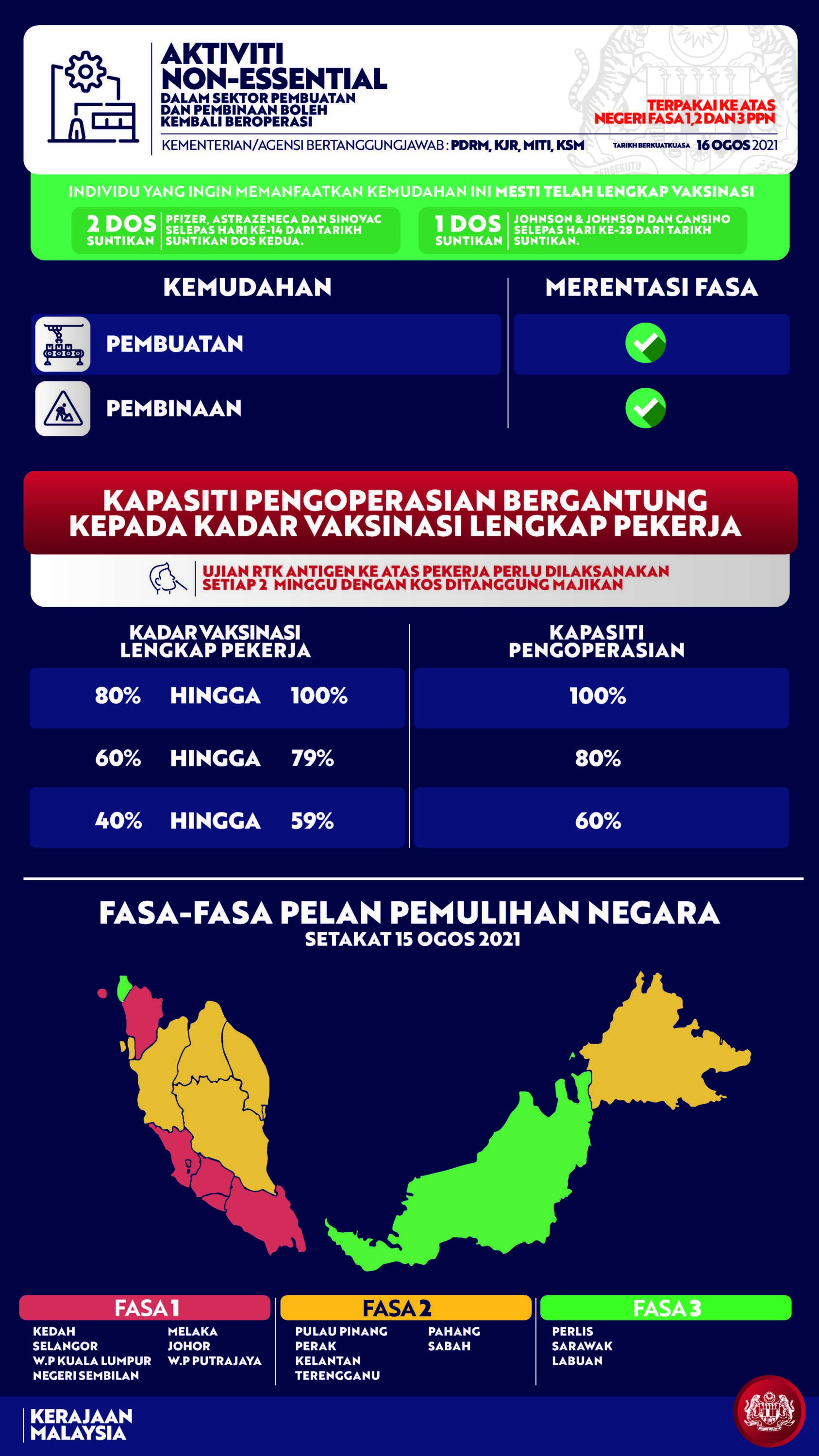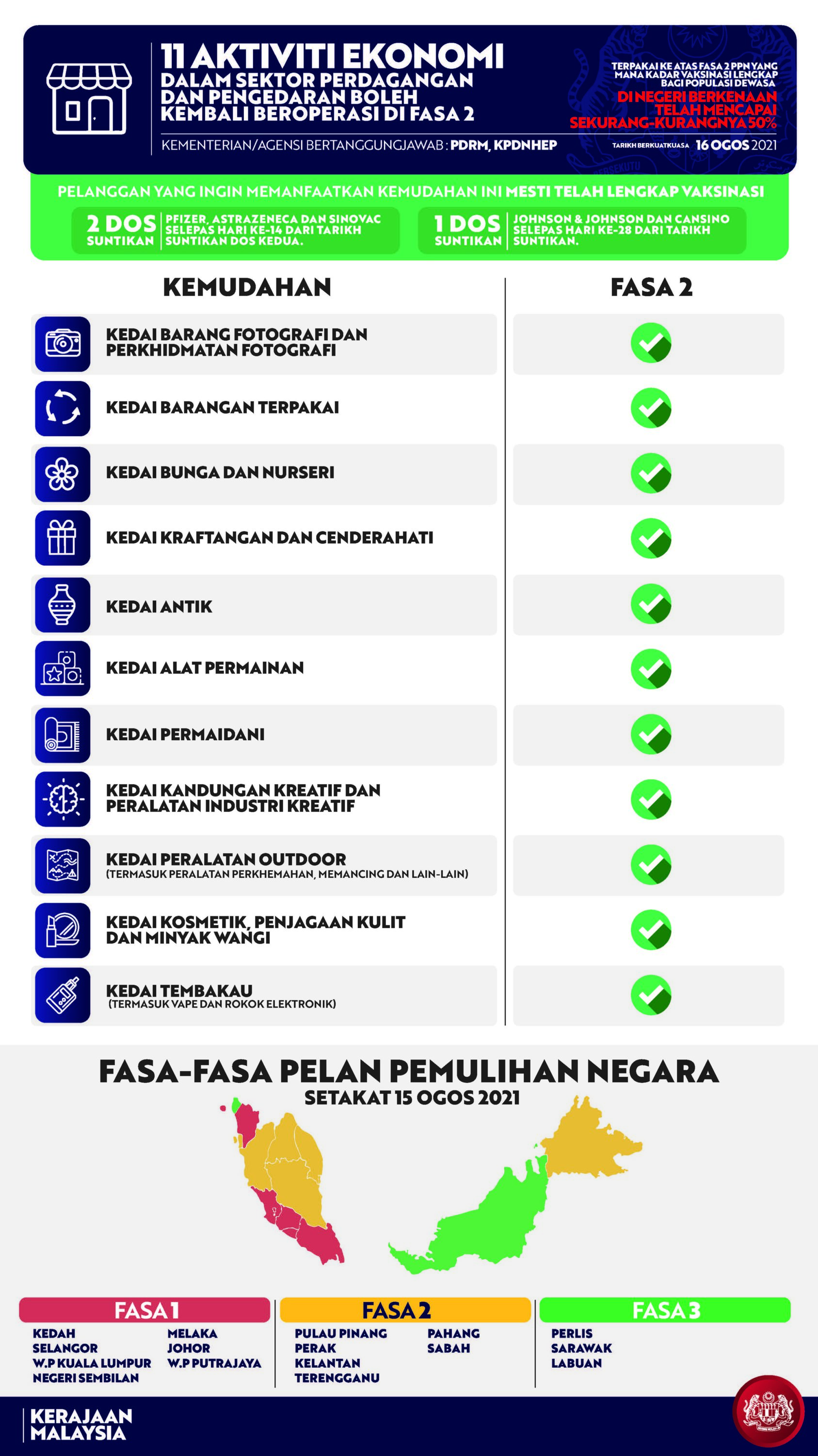 Beliau berkata, kemudahan diumumkan itu boleh dilaksanakan di negeri Fasa 1 dan Fasa 2, dengan syarat vaksinasi lengkap penduduk dewasa di negeri berkenaan sudah mencapai sekurang-kurangnya 50 peratus.