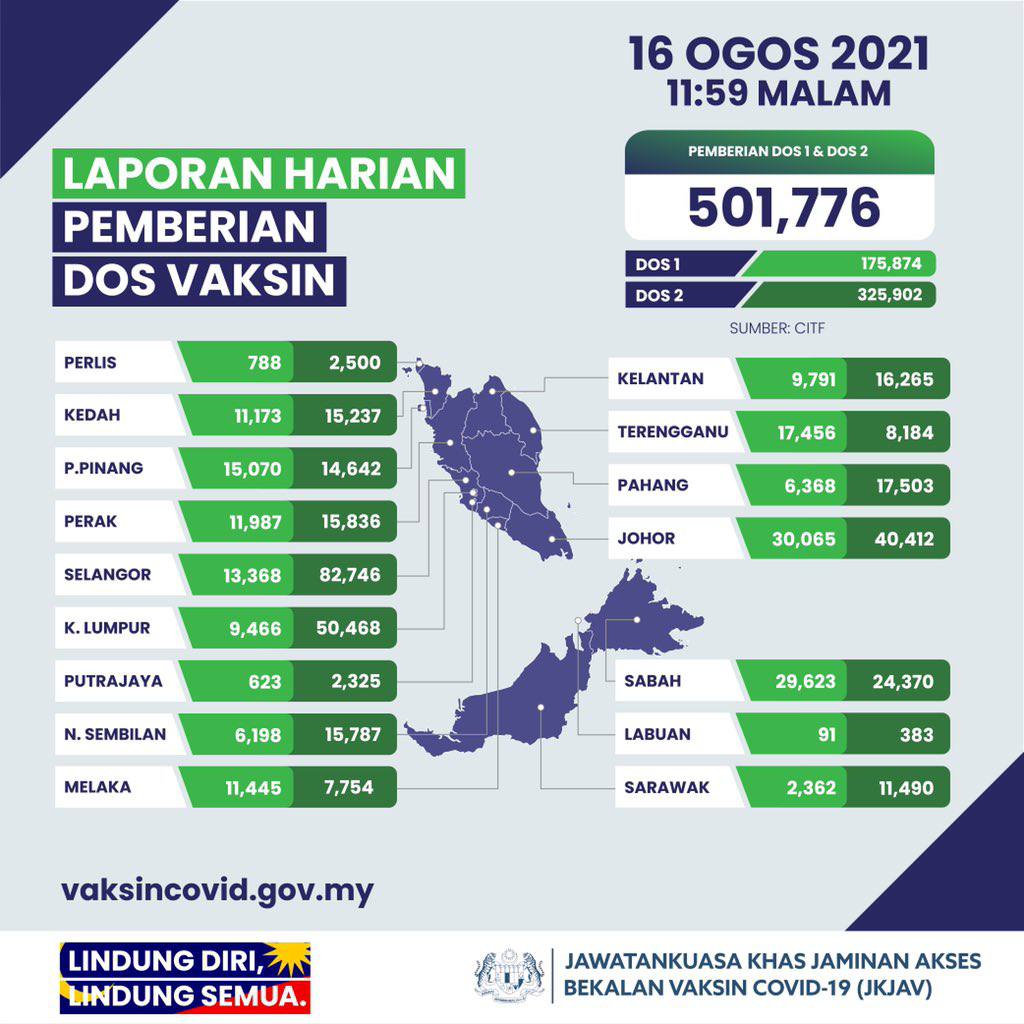 Sementara itu, vaksinasi harian mencatatkan 501,776 dos semalam, dengan 175,874 individu mendapat dos pertama, manakala 325,902 penerima membabitkan dos kedua.