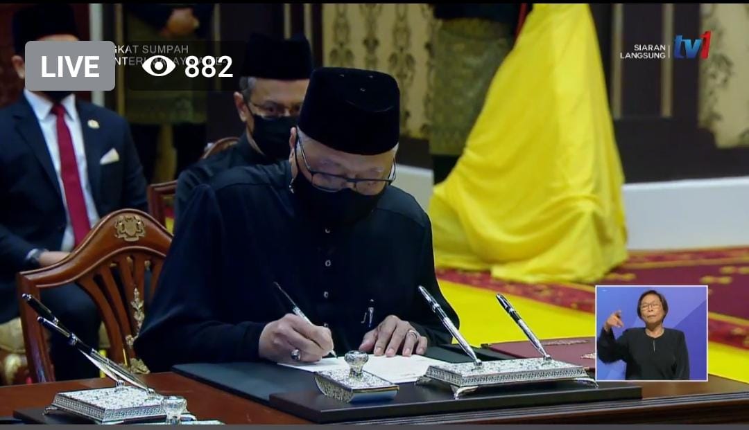 Setelah membaca ikrar angkat sumpah jawatan di hadapan baginda, Ismail kemudian menandatangani dokumen berkenaan.