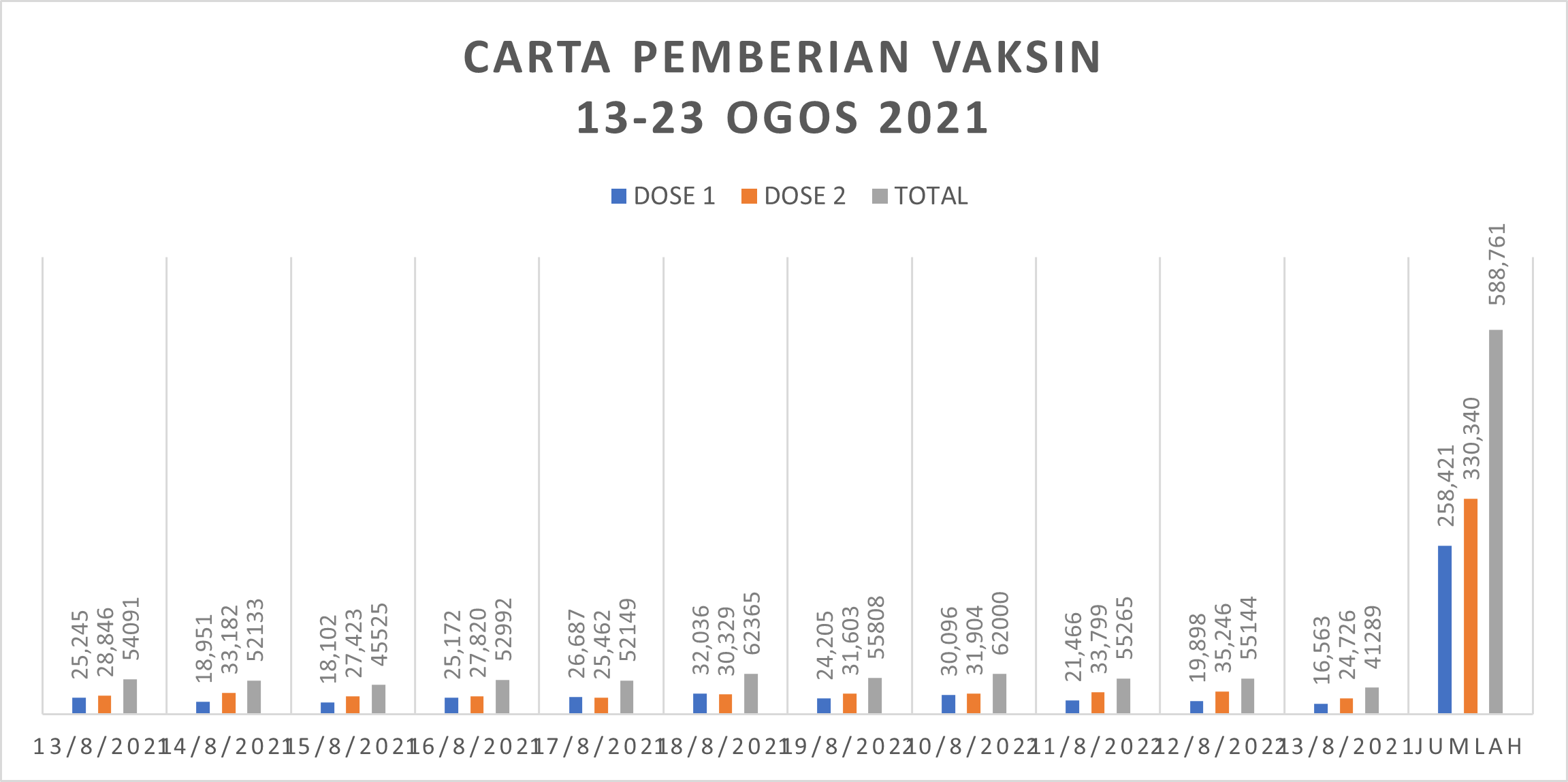 Ini menjadikan secara puratanya sejumlah 53,524 ribu dos berjaya diberikan secara harian di dalam tempoh itu dan jumlah tertinggi pemberian harian ialah 62,365 ribu dos sehari ialah pada 17 Ogos lalu ( data 18 Ogos) manakala jumlah terendah ialah 41,289 ribu dos ( data 23 ogos).