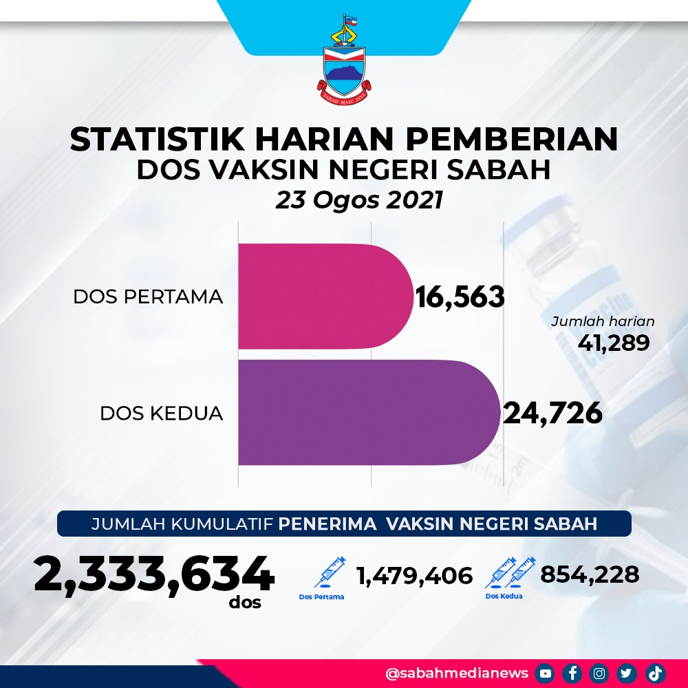 Daripada jumlah itu sebanyak 330,340 orang menerima dos kedua vaksin COVID-19 di Sabah yang menjadikan keseluruhannya 854,228 orang telah melengkapkan dua dos vaksin di negeri itu.