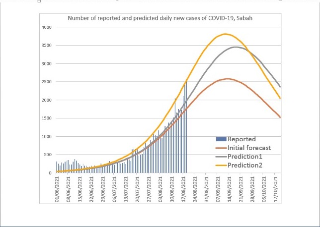“Dengan menggunakan model epidemiologi dan berdasarkan trend harian kes COVID-19 yang dilaporkan dari 1 Jun 2021 hingga 18 Jun 2021, diramalkan bahawa jumlah kes akan tetap meningkat dengan bilangan kes sekitar 2000-2500 dalam 2-3 minggu akan datang,” katanya.