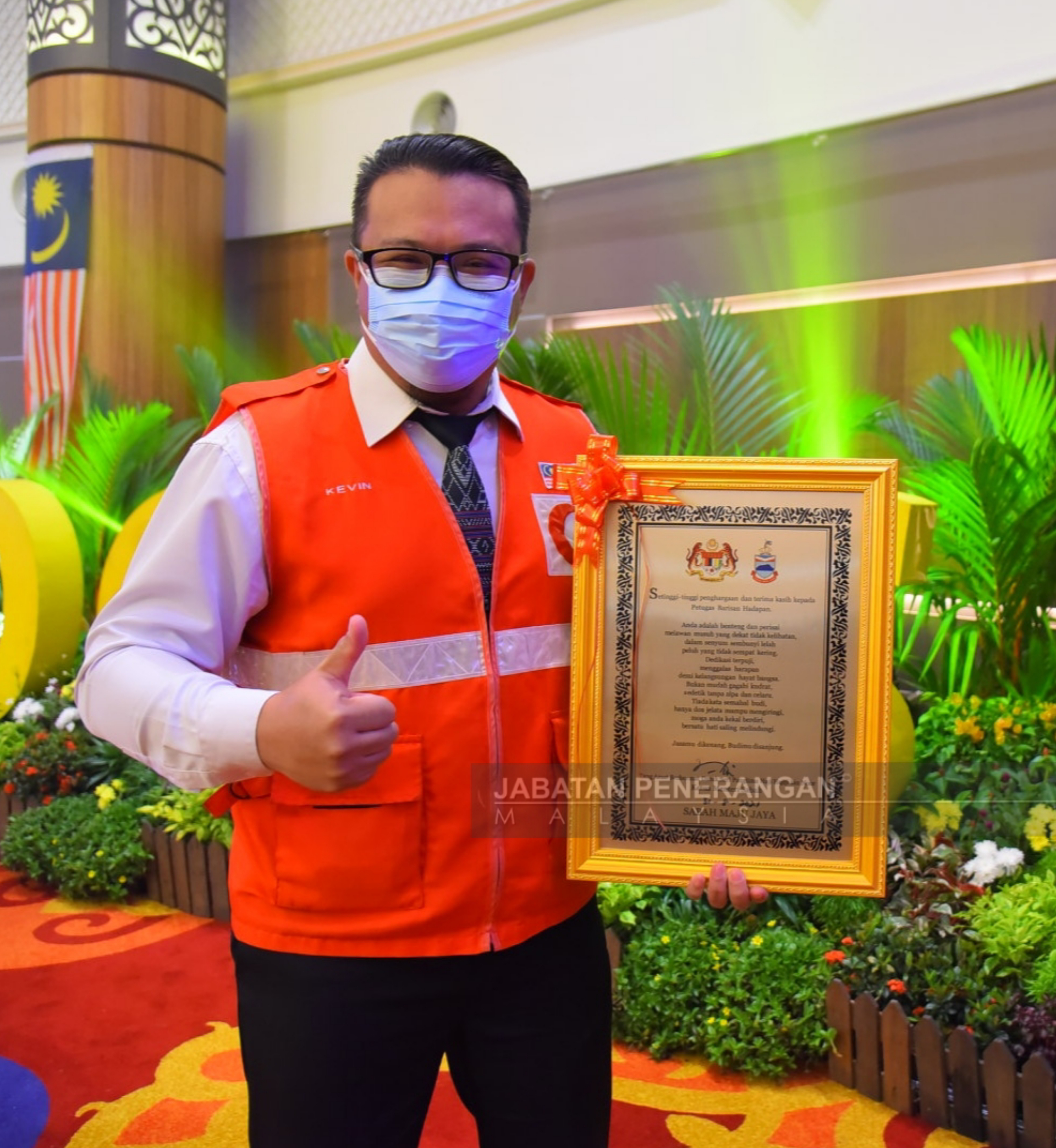 Penolong Pengarah Belia Bulan Sabit Merah Malaysia (BSMM), Kevin Lo, 37, dari Tuaran merupakan antara 10 penerima memento yang dinukilkan khas untuk mengiktiraf dan sekaligus memberi penghormatan kepada semua petugas barisan hadapan yang menjalankan tugas dengan penuh dedikasi tanpa mengira masa.