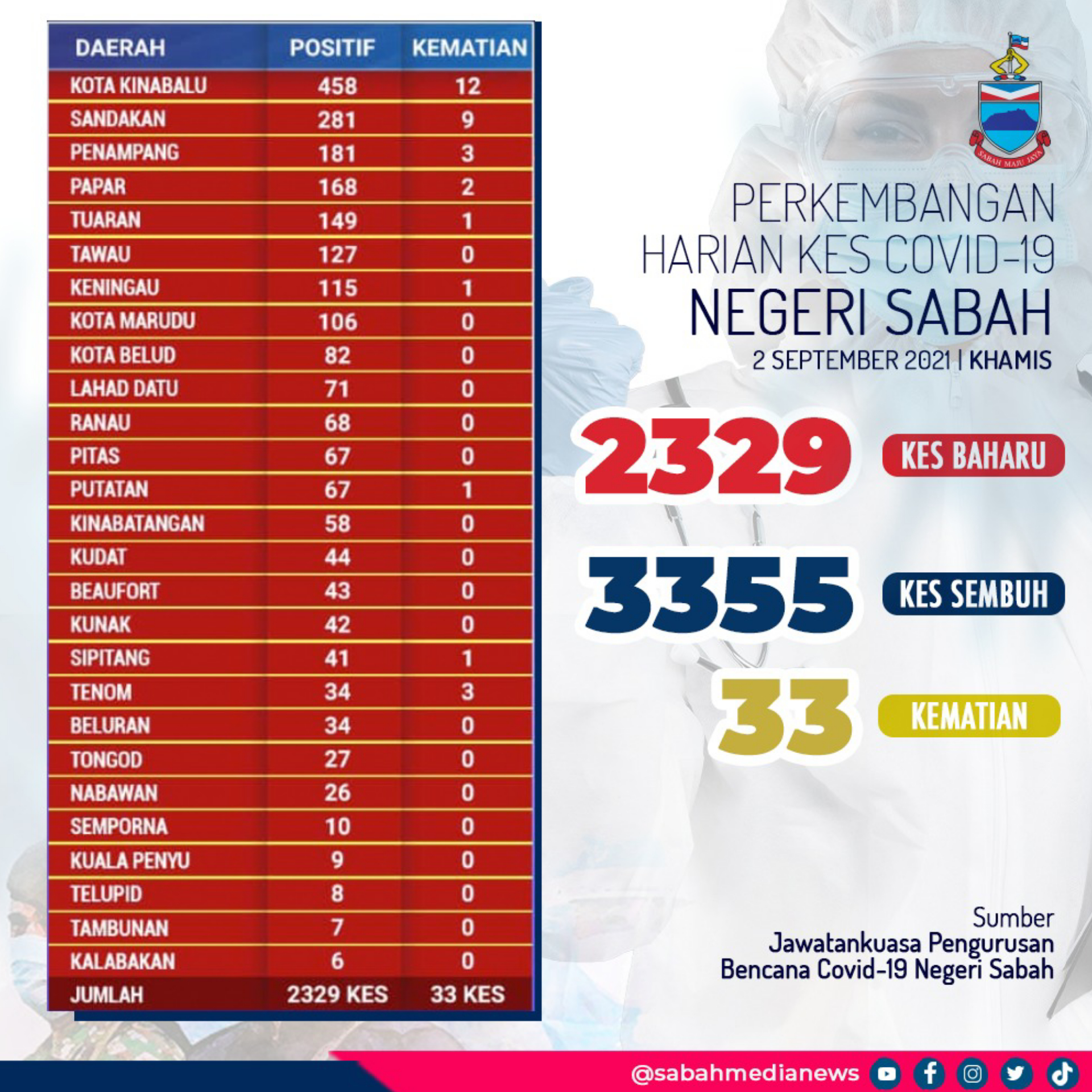 KOTA KINABALU: Sebanyak 2,329 kes positif COVID-19 baharu dilaporkan di Sabah hari ini, namun terdapat 33 kes kematian turut dilaporkan melibatkan 12 kes di Kota Kinabalu, sembilan kes di Sandakan, Penampang dan Tenom mencatatkan tiga kes, dua kes di Papar manakala Tuaran, Putatan, Sipitang dan Keningau masing-masing mencatatkan satu kes.