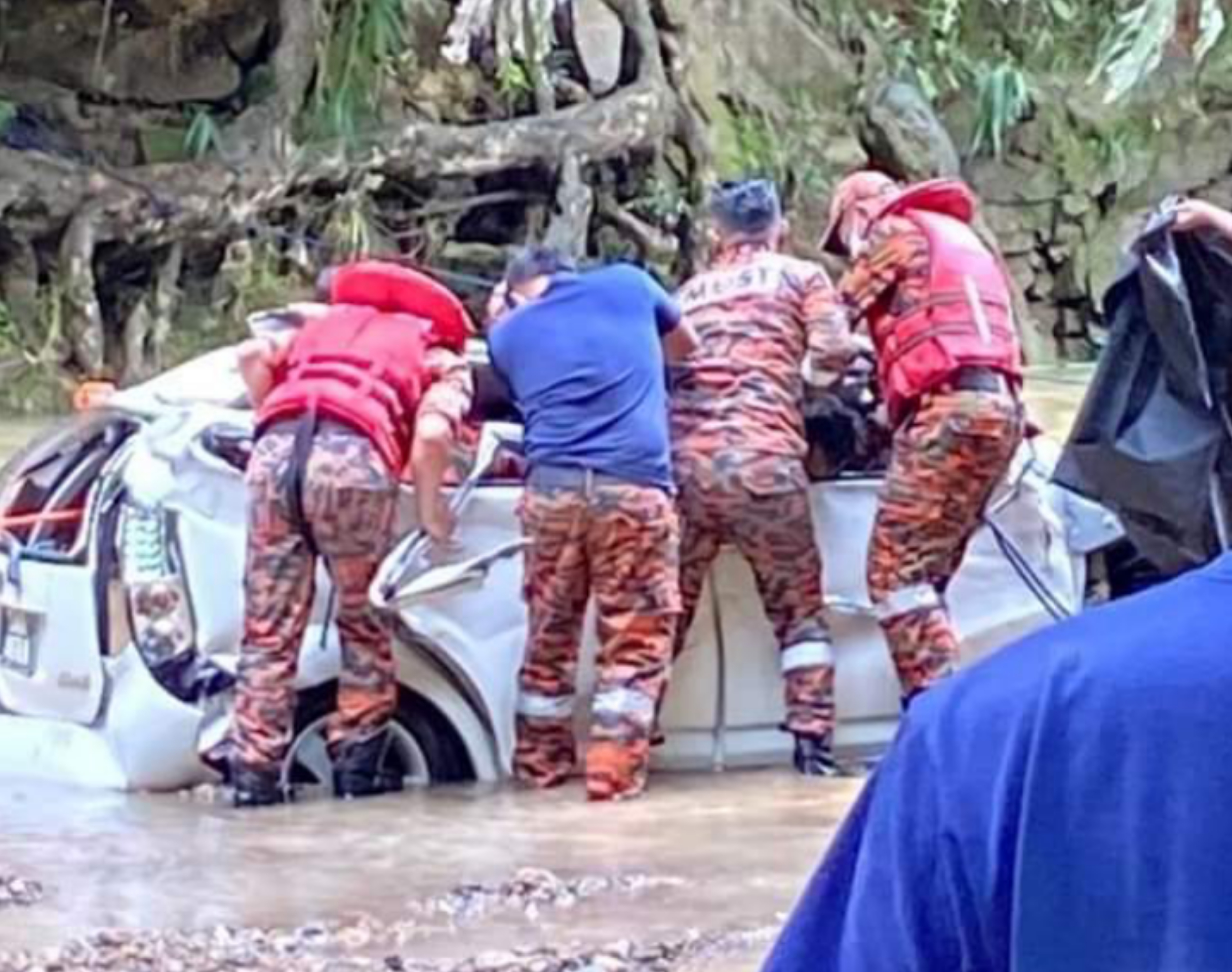 Manakala seorang lagi mangsa iaitu pemandu kereta tersebut masih belum ditemui. Operasi pencarian bagi mangsa kedua masih dijalankan bersama Unit K9, PPDA, Polis dan Penduduk kampung.