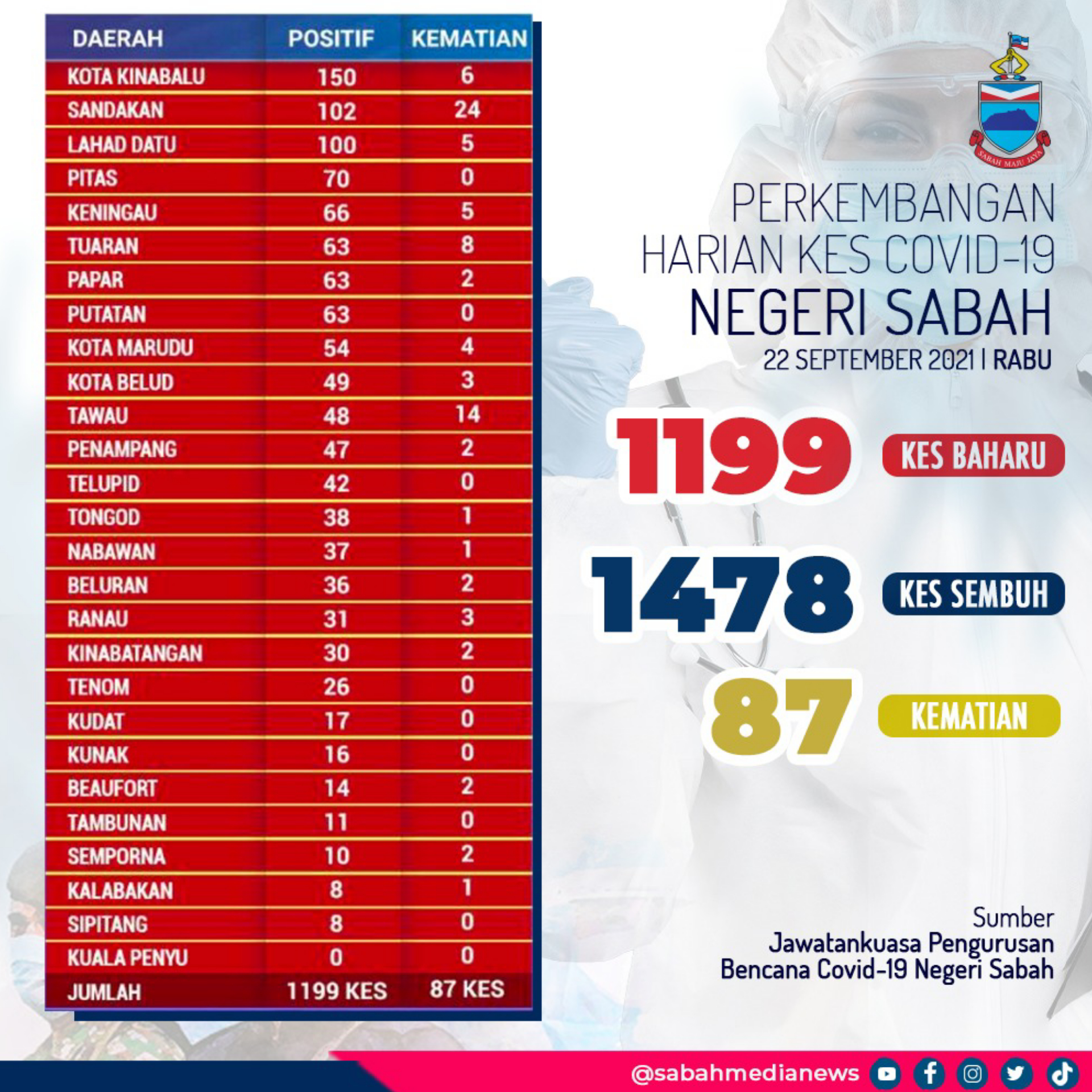KOTA KINABALU: Jumlah kes positif baharu COVID-19 hari ini sebanyak 1,199 kes, merupakan angka terendah sejak 6 Ogos lalu, selain turut dilaporkan jumlah kes kematian yang tinggi akibat jangkitan COVID-19 iaitu sebanyak 87 kes iaitu 24 kes di Sandakan, 14 kes di Tawau, lapan kes di Tuaran, enam kes di Kota Kinabalu, lima kes di Lahad Datu dan Keningau, empat kes di Kota Marudu, tiga kes di Ranau dan Kota Belud. Dua kes kematian dicatatkan di Beaufort, Kinabatangan, Penampang, Beluran, Semporna dan Papar manakala Nabawan, Kalabakan dan Tongod masing-masing mencatatkan satu kes.