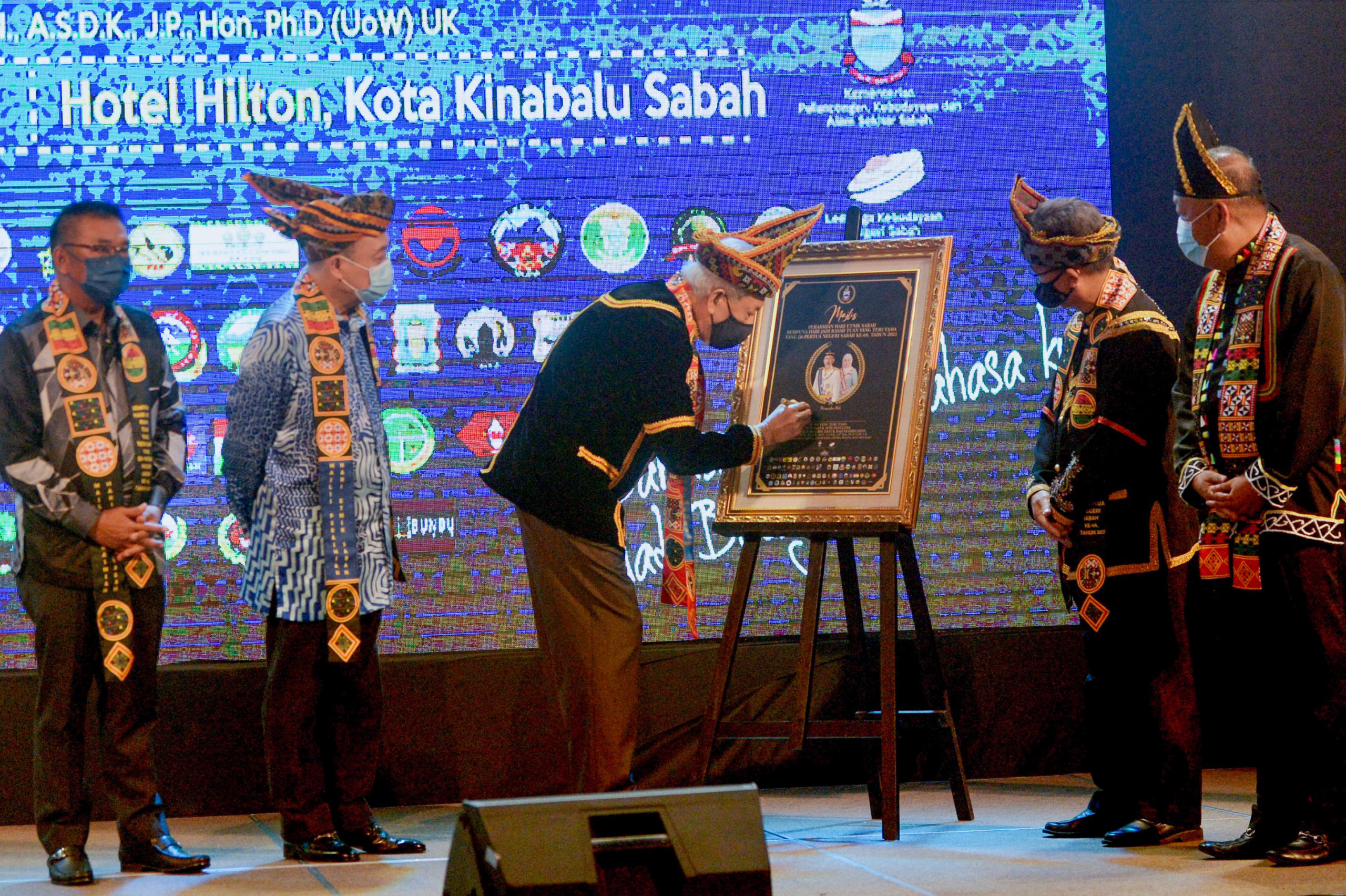 menandatangani plak perasmian Hari Etnik Sabah sempena Hari Jadi rasmi Tuan Yang Terutama Yang di-Pertua Negeri Sabah ke-68 sambil disaksikan oleh Ketua Menteri Datuk Seri Hajiji Noor. Turut kelihatan ialah