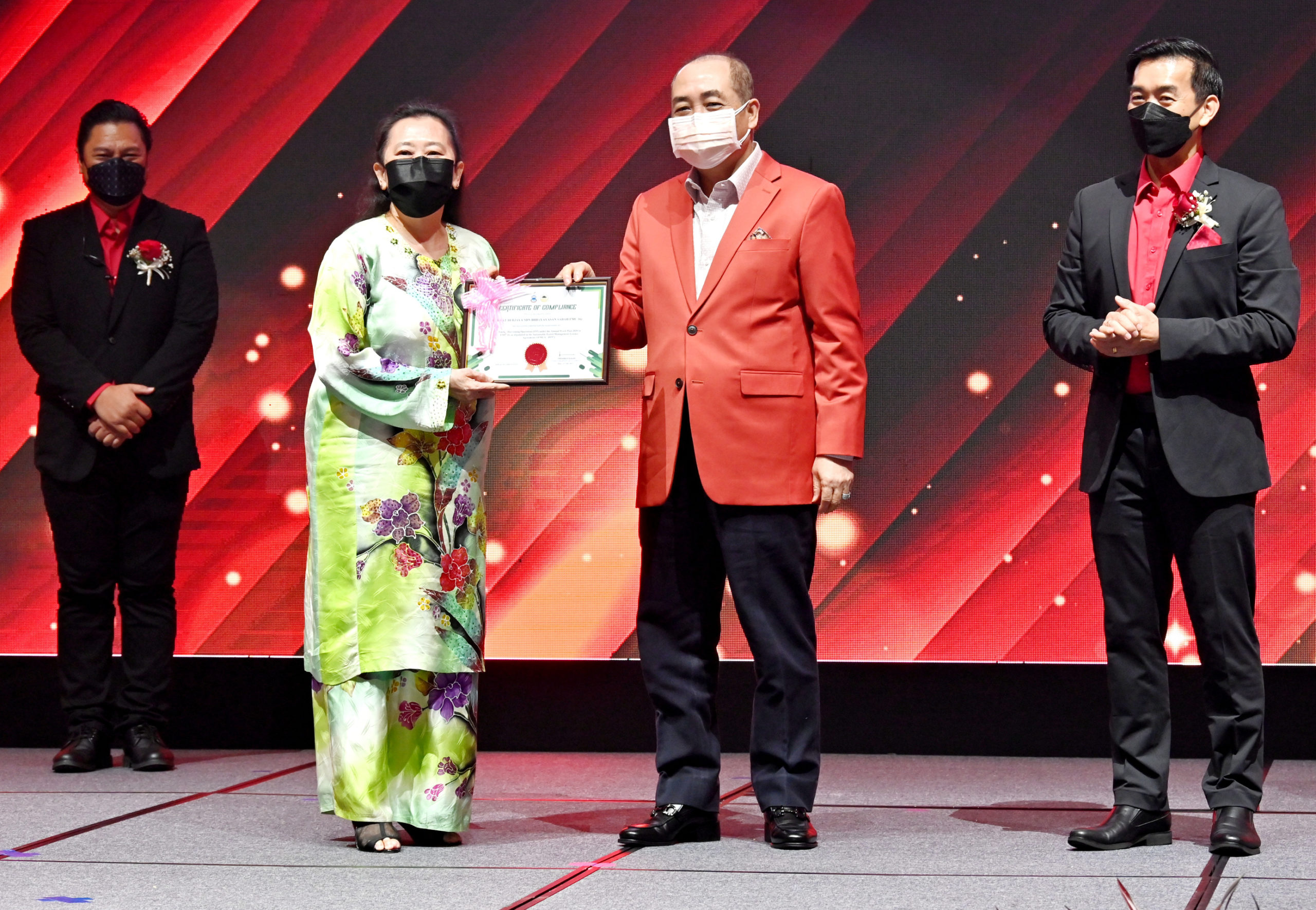 anugerah Compliance Certificate kepada Yayasan Sabah (YS) yang diterima oleh Pengurus Kumpulan YS, Dr.Esther Li (dua dari kiri). Yayasan Sabah menerima 2 Compliance Certificate untuk tahun 2019 dan 2020 bagi pelaksanaan aktiviti SFM di FMU 15 dan 16. – Foto Ihsan Jabatan Ketua Menteri