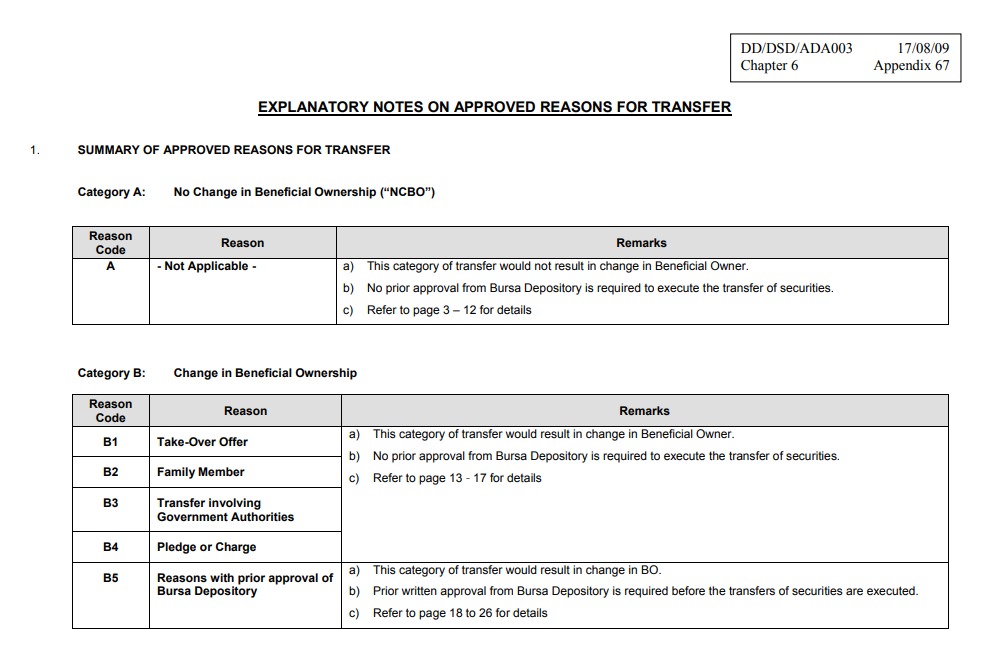 Manakala di dalam klausa lain, ianya membenarkan pemindahan antara pihak yang memindahkan (orang yang memulakan pemindahan) dan pihak yang dipindahkan (orang yang menerima sekuriti yang dipindahkan), yang terdiri daripada ahli keluarga terdekat. Berikut adalah hubungan yang dibenarkan: