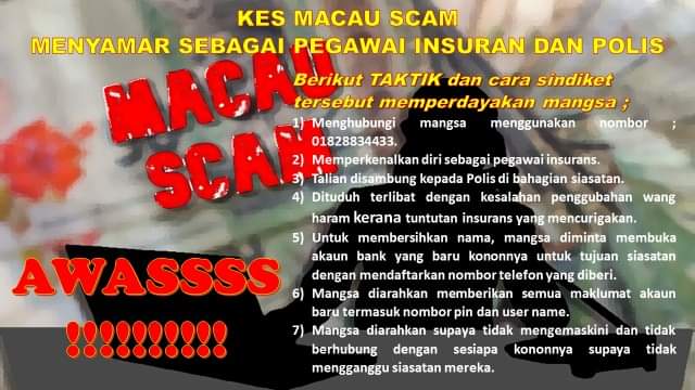 BEAUFORT: Seorang kontraktor wanita kerugian sebanyak RM 294,118.50 setelah diperdaya sindiket Macau Scam oleh beberapa individu yang menyamar sebagai pegawai insuran dan polis melalui dalam talian.
