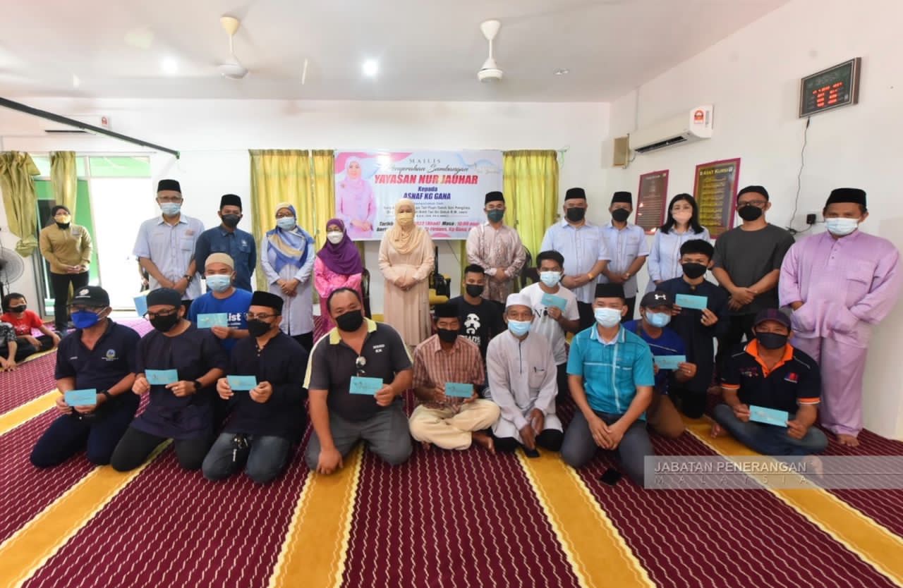 Terdahulu, Toh Puan Norlidah menyampaikan sumbangan sama kepada 70 asnaf di Surau Al-Firdaus Kampung Gana.