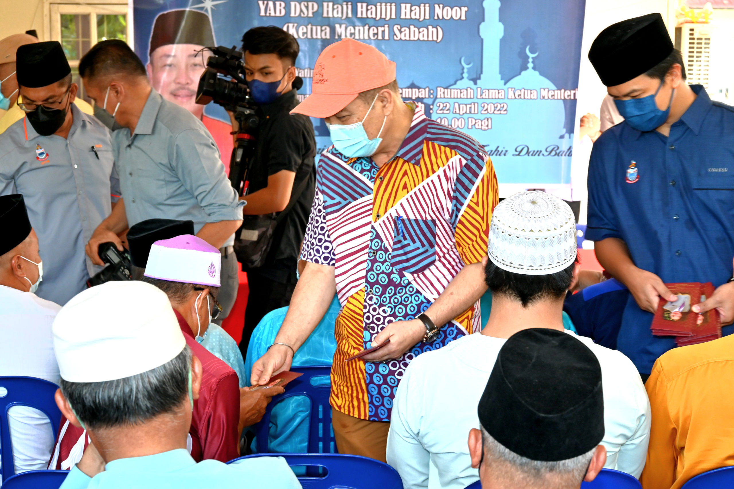 Sumbangan disampaikan oleh Ketua Menteri, Datuk Seri Hajiji Noor sempena bulan Ramadan dan Aidilfitri kepada anak-anak yatim, orang kurang upaya (OKU), mualaf, pengerusi dan imam-imam masjid serta surau kawasan tersebut.