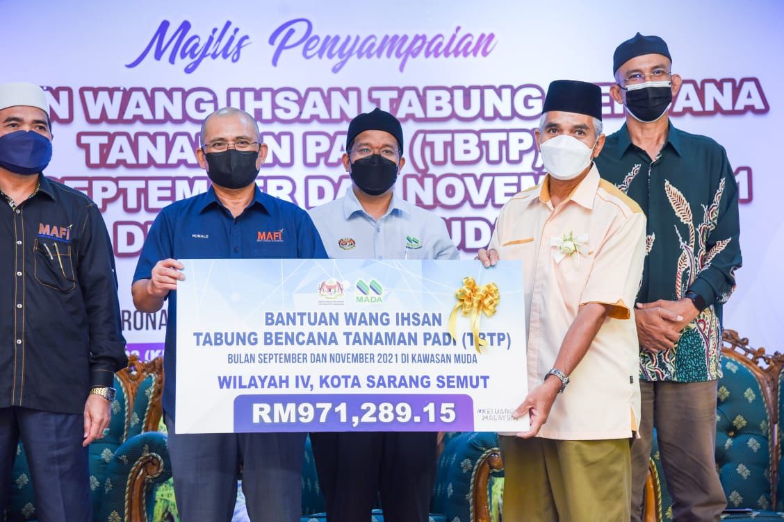 Majlis Penyampaian Bantuan Wang Ihsan Tabung Bencana Tanaman Padi (TBTP) Bulan September dan November 2021 bagi kawasan MADA semalam disempurnakan Menteri MAFI Datuk Seri Dr. Ronald Kiandee, melibatkan peruntukan sebanyak RM876 per hektar manakala bagi pokok padi yang berusia 71 hari keatas, bantuan yang diberikan adalah sebanyak RM1,800 per hektar.