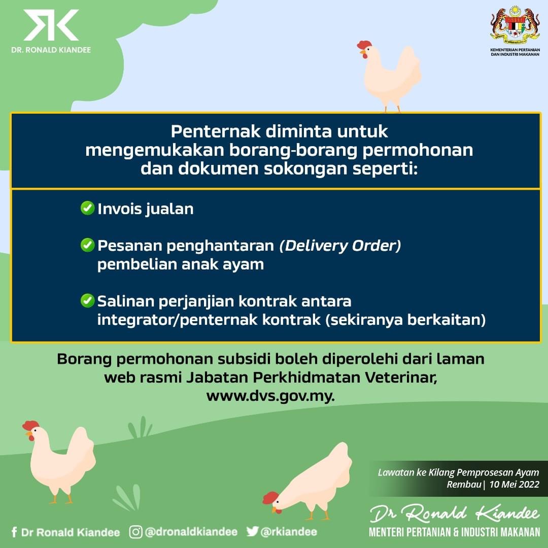 Beliau berkata, penternak diminta untuk mengemukakan borang permohonan dan dokumen sokongan seperti invois jualan, pesanan penghantaran pembelian anak ayam dan salinan perjanjian kontrak antara “integrator” atau penternak kontrak bagi menuntut subsidi dalam tempoh yang ditetapkan.