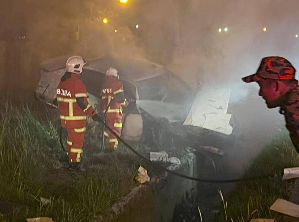 “Sepasukan anggota Bomba bergegas ke lokasi kejadian mendapati kebakaran kereta jenis Toyota Aristo terbakar 60 peratus selepas terlibat kemalangan dengan kereta jenis BMW dan Toyota Hilux. Operasi pemadaman dilakukan menggunakan satu aliran salur bantu mula air dari tangki jentera.