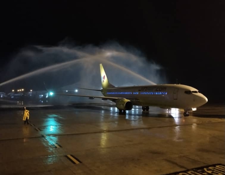 Ketibaan pesawat LJ061 itu disambut dengan pancutan air sebaik sahaja mendarat di KKIA sebagai mengalu-alukan penerbangan pertama dari negara Korea itu selepas sempadan dibuka semula bagi peralihan fasa endemik negara.