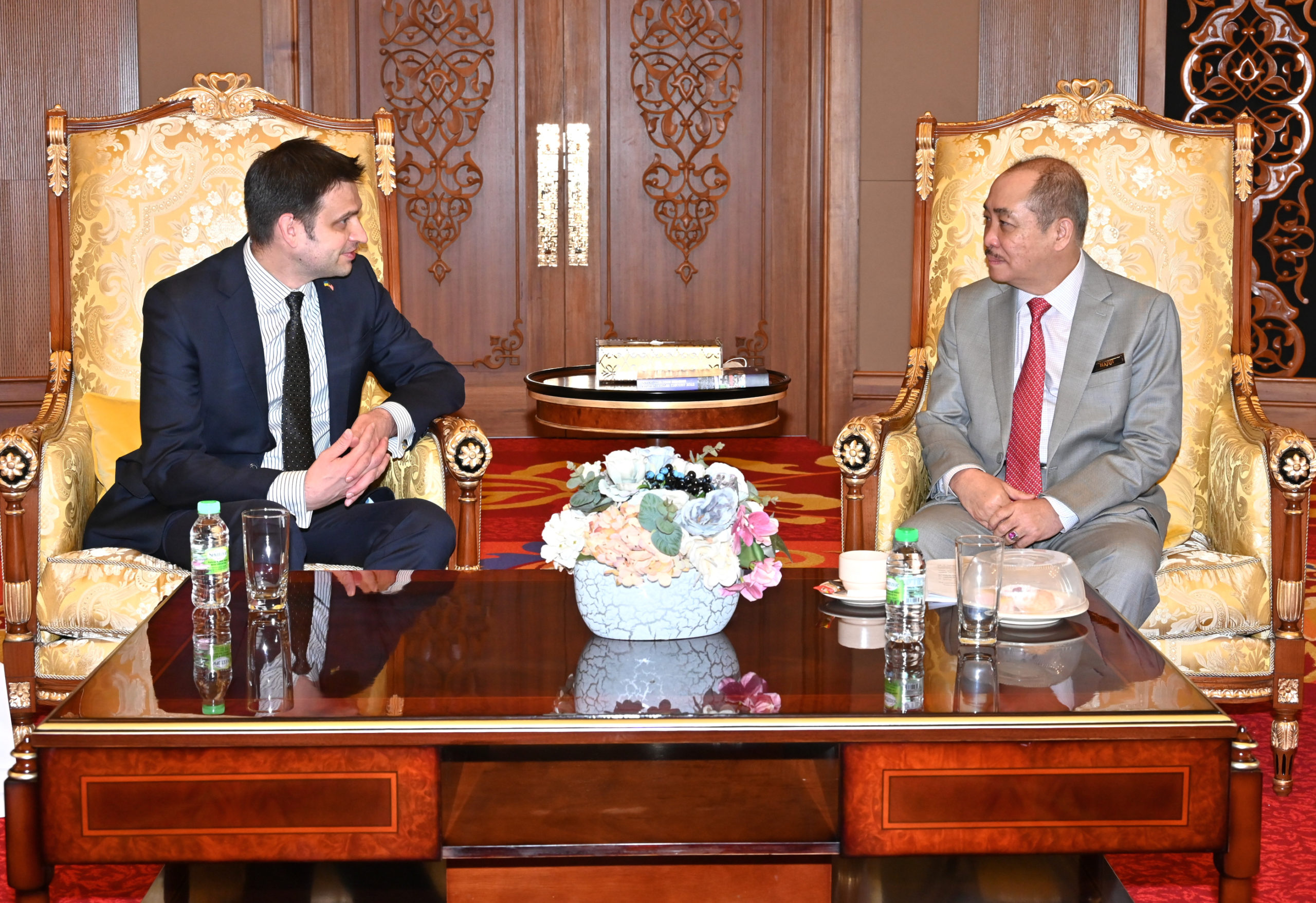 KOTA KINABALU: Ketua Menteri, Datuk Seri Hajiji Noor menerima kunjungan hormat perpisahan daripada Duta Besar Ukraine ke Malaysia, TYT Olexander Nechytaylo di pejabatnya di Menara Kinabalu, di sini, kelmarin.