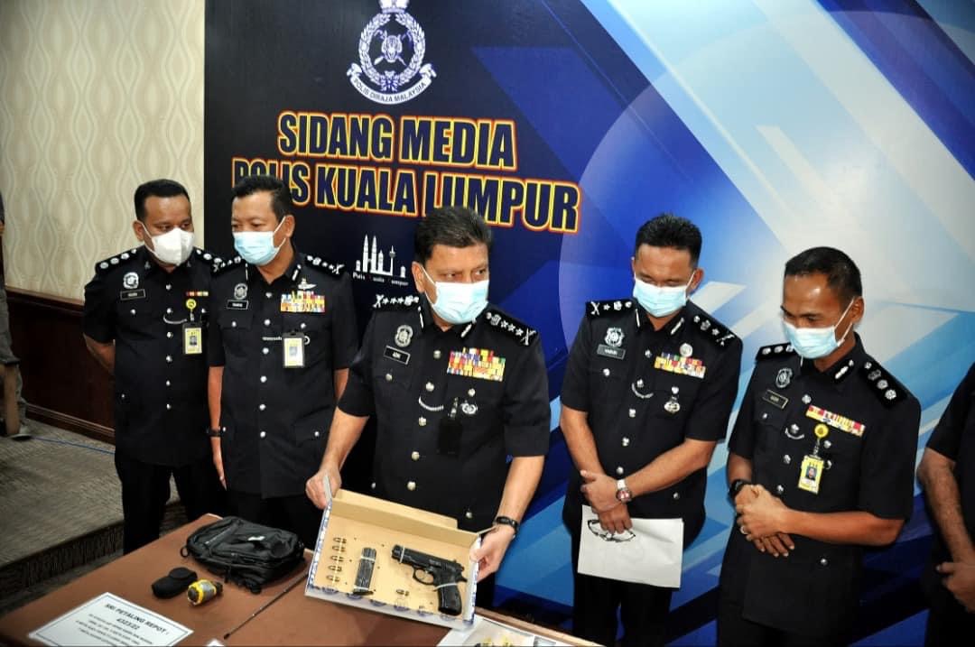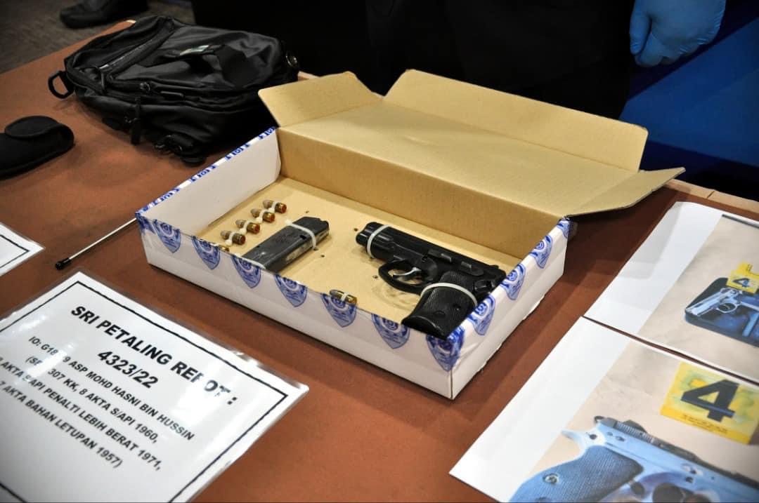 Dalam serbuan itu, polis menemui sepucuk pistol dan bom tangan dalam beg suspek.
