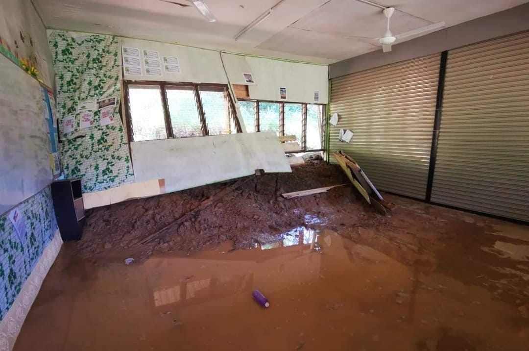 “Dinding sebuah bangunan bilik darjah SK Sabandil dilaporkan rosak teruk akibat tanah runtuh dalam kejadian awal pagi tadi.