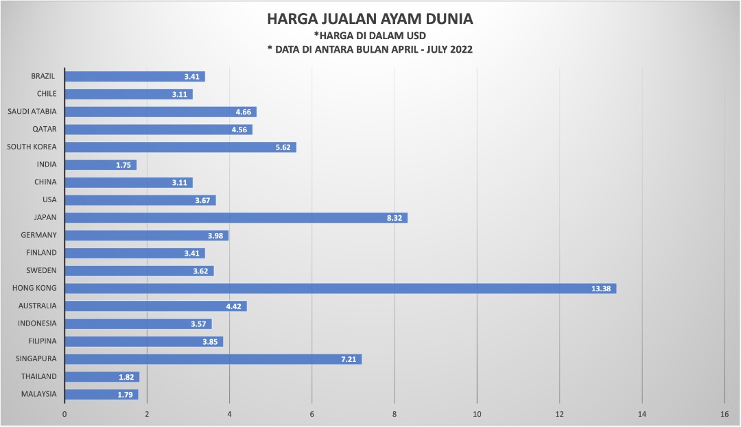 Katanya, semakan juga mengenai harga jualan ayam di beberapa buah negara di dunia menyaksikan Malaysia merupakan antara negara yang menjual ayam pada harga yang rendah.