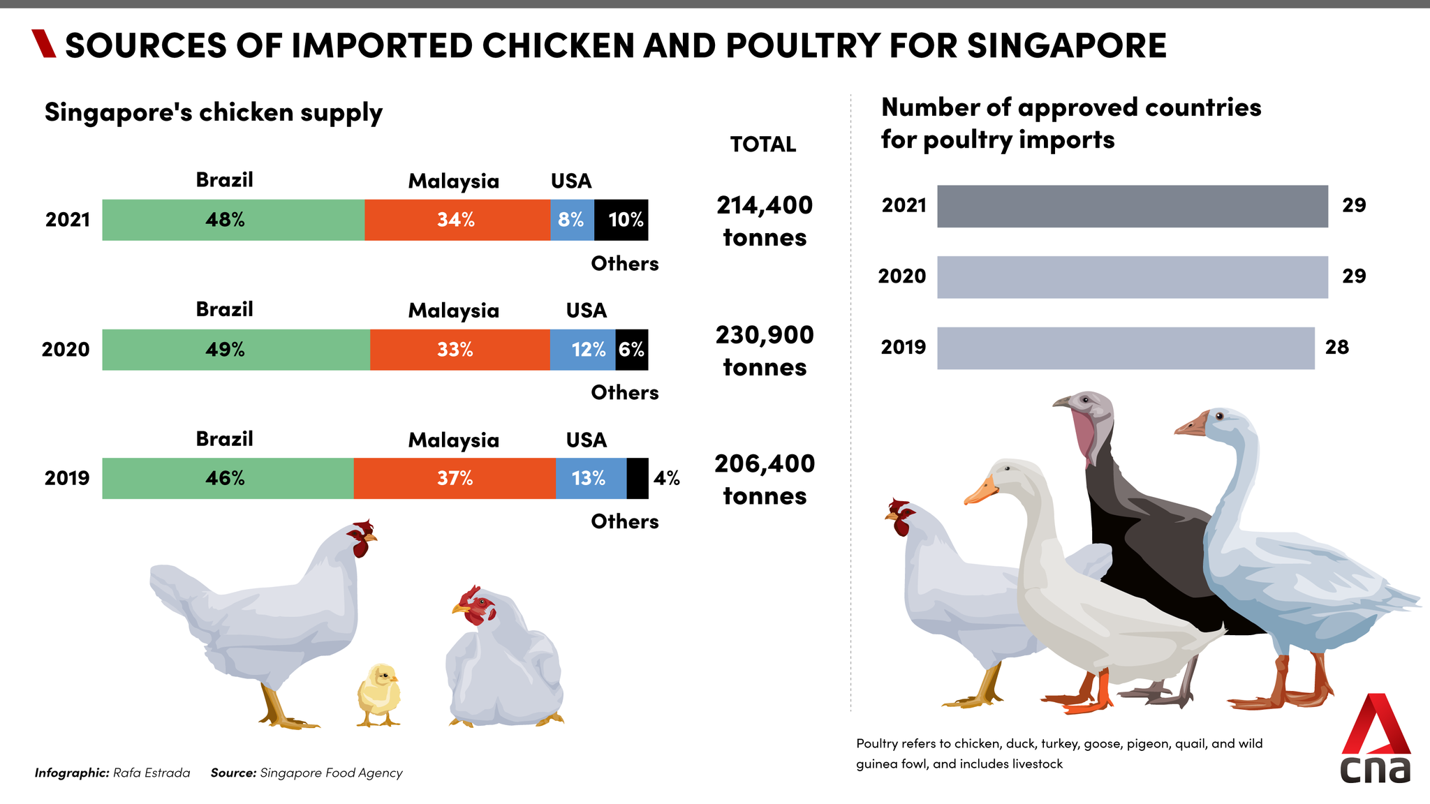 Singapura amat terkesan dengan tindakan Kerajaan Malaysia tersebut kerana 34% daripada keperluan ayam Singapura adalah import dari Malaysia. Singapura mengimport sebanyak 46 juta ekor ayam setahun (3.8 juta sebulan) dari Malaysia, iaitu 97% dari jumlah eksport ayam Malaysia. Seterusnya, Singapura dengan segera telah memberi akreditasi kepada Indonesia dan telah mula mengimport ayam dari Indonesia. Sebelum ini, Singapura tidak pernah mengimport ayam dari Indonesia!