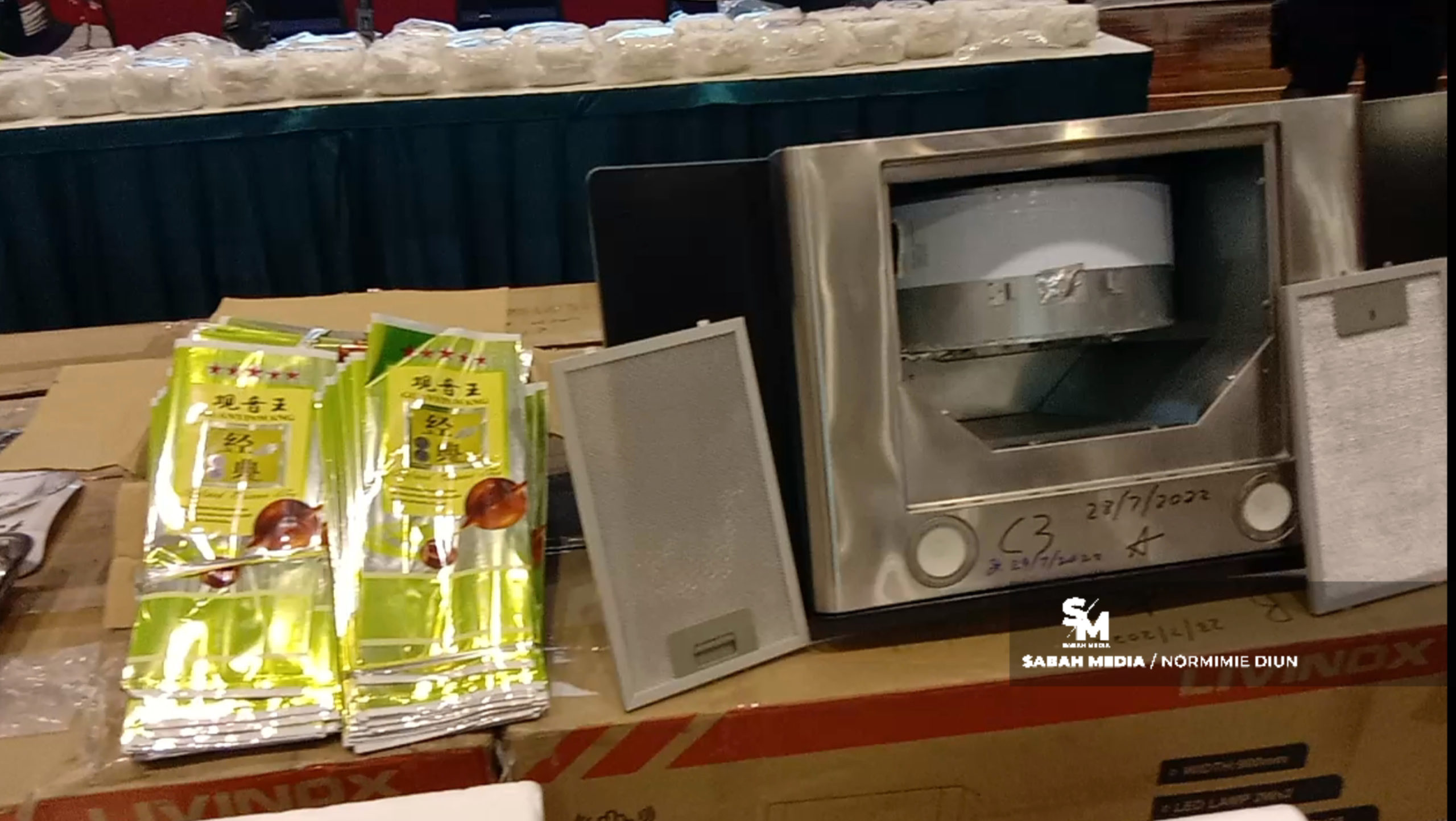 “Bahan disyaki dadah yang telah siap dibungkus disembunyikan di dalam peralatan elektrik dapur dan disimpan di dalam kotak peralatan elektrik dapur tersebut bagi tujuan mengaburi mata pihak penguatkuasaan.