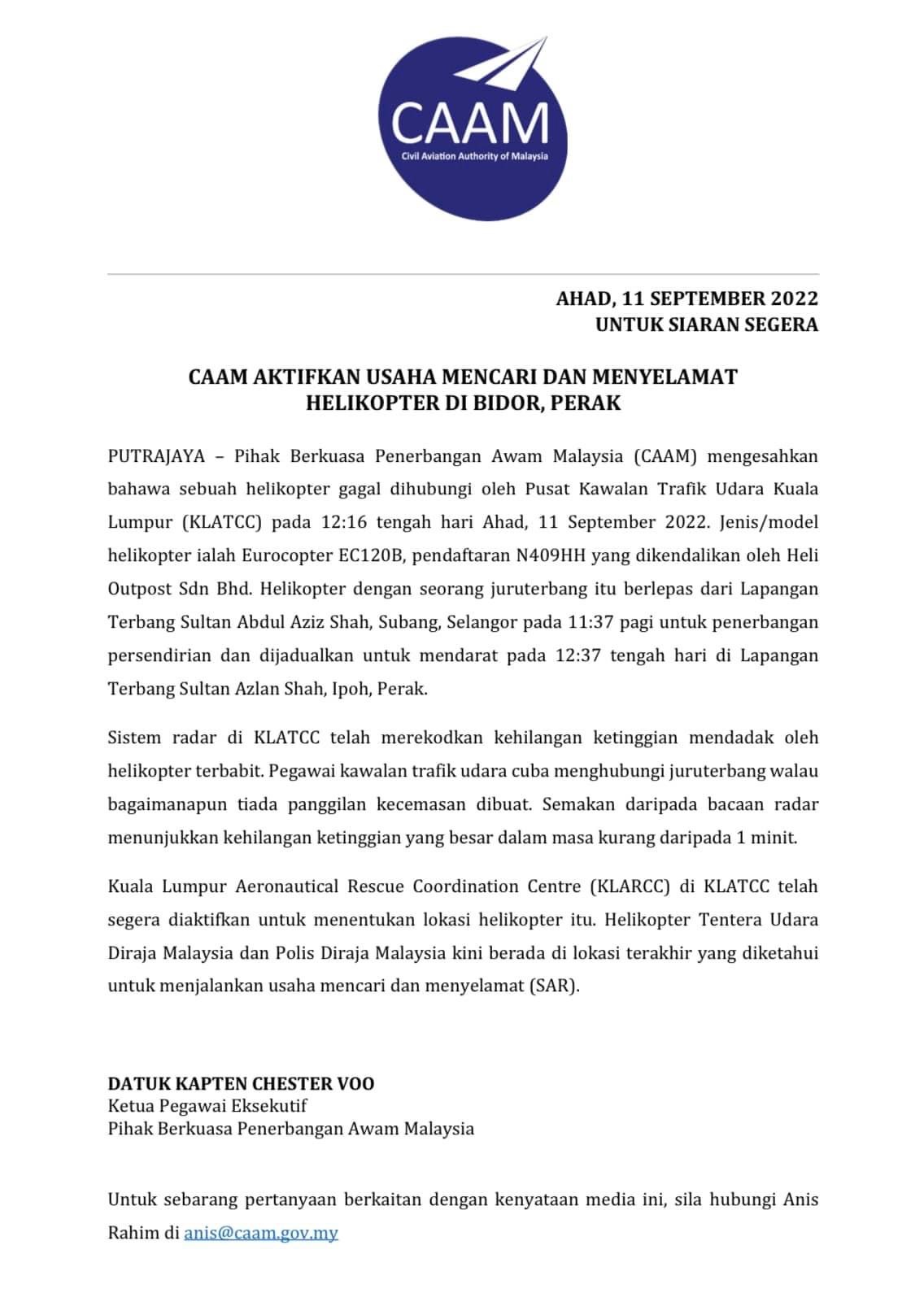 “Helikopter berkenaan dijadualkan mendarat di Lapangan Terbang Sultan Azlan Shah Ipoh pada jam 12.37 tengah hari tetapi dilaporkan hilang dan terputus hubungan dengan Pusat Kawalan Trafik Udara Kuala Lumpur pada jam 12.16 tengah hari tadi.