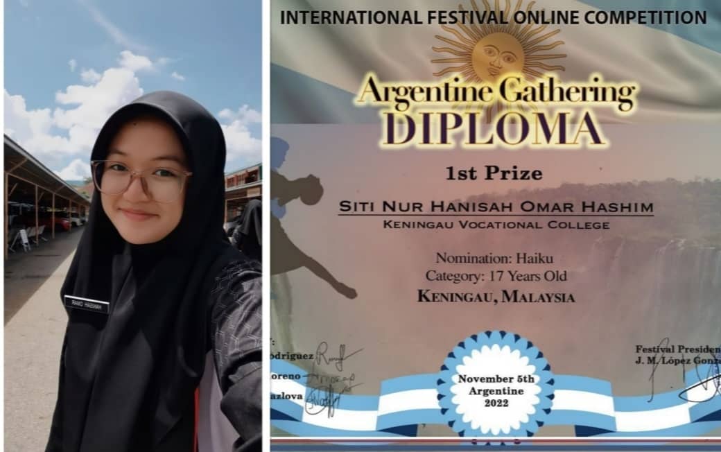 KENINGAU: Siti Nur Hanisah Omar Hashim, pelajar jurusan Pendidikan Awal Kanak-kanak Kolej Vokasional Keningau, telah dinobatkan sebagai pemenang tempat pertama dalam Pertandingan Menulis Haiku di Festival Seni “Argentine Gathering” yang berlangsung secara dalam talian pada 5 November lalu.