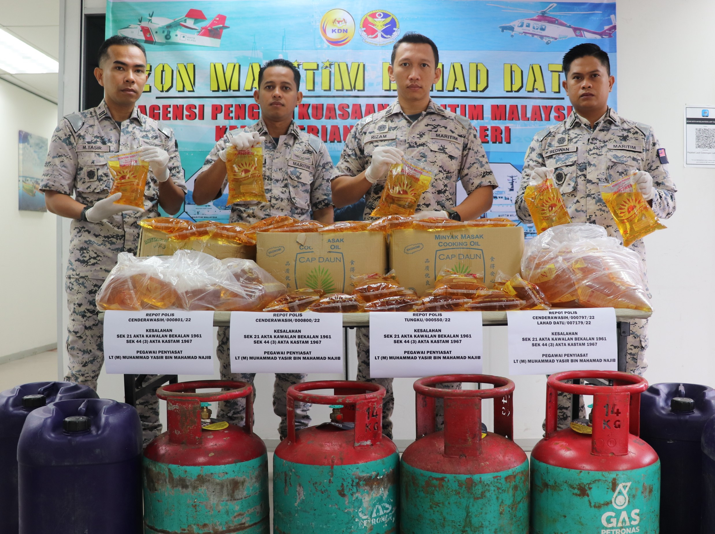 Tambahnya lagi, pemeriksaan menyeluruh ke atas empat buah bot tersebut telah menemukan pelbagai barang kawalan berjadual iaitu 3,791 kilogram (kg) peket minyak masak bersubsidi pelbagai jenama berserta 16 tong gas LPG bersubsidi dipercayai cuba diseludup ke negara jiran.