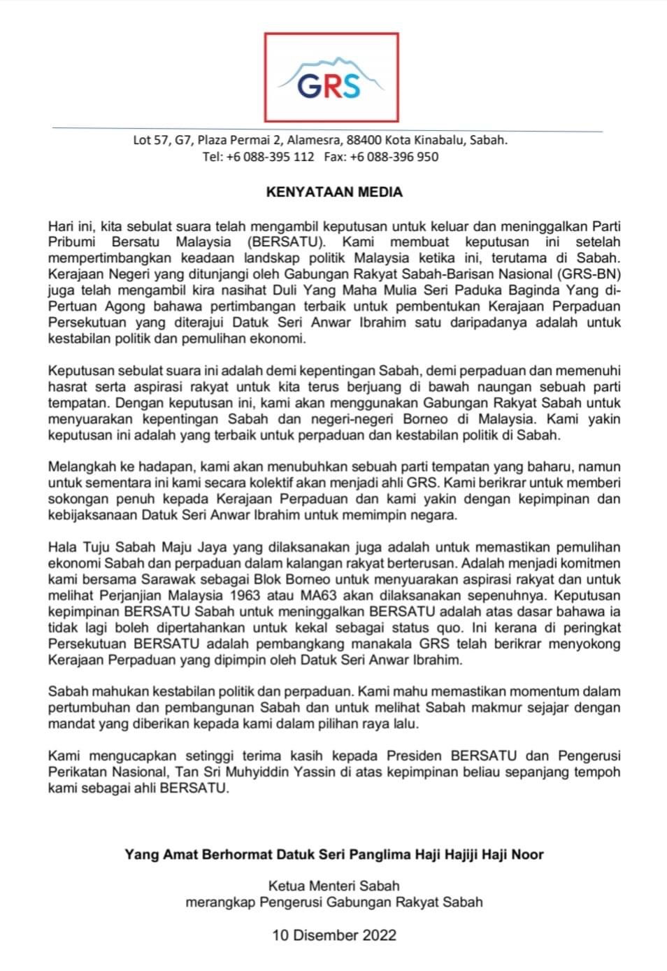 “Dengan keputusan ini, kami akan menggunakan GRS untuk menyuarakan kepentingan Sabah dan negeri-negeri Borneo di Malaysia. Kami yakin keputusan ini adalah yang terbaik untuk perpaduan dan kestabilan politik di Sabah.