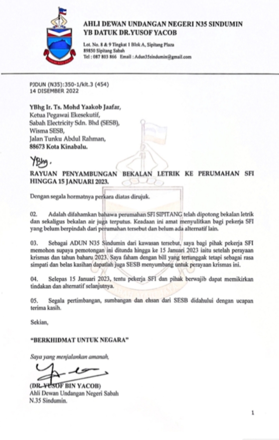 Prihatin dengan keadaan pekerja dan ahli keluarga yang tinggal di perumahan SFI, Ahli Dewan Undangan Negeri (ADUN) Sindumin Datuk Dr Yusof Yacob telah mengutus surat rayuan kepada SESB supaya menyambung semula bekalan elektrik ke perumahan SFI pada hari ini.