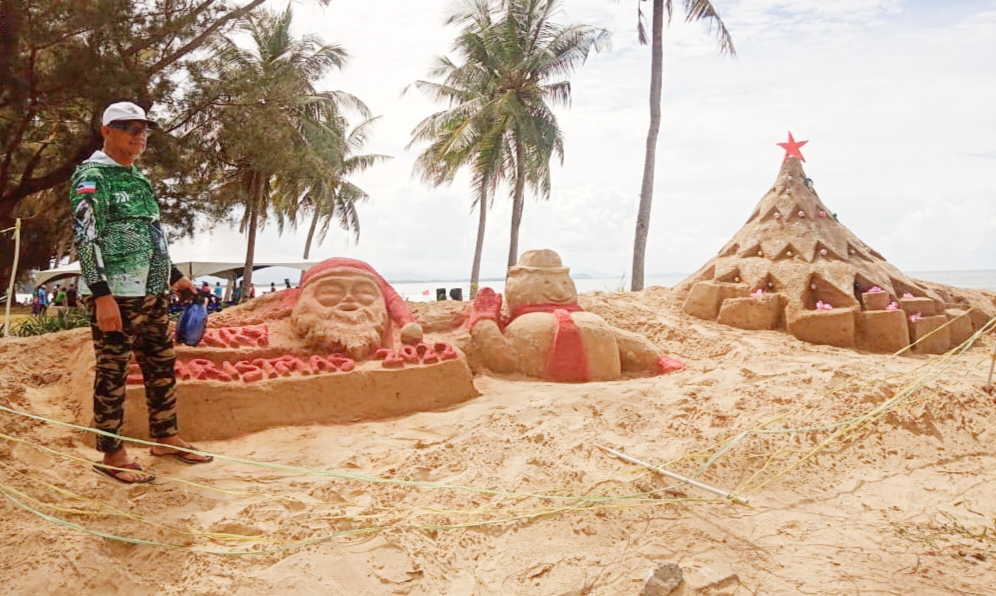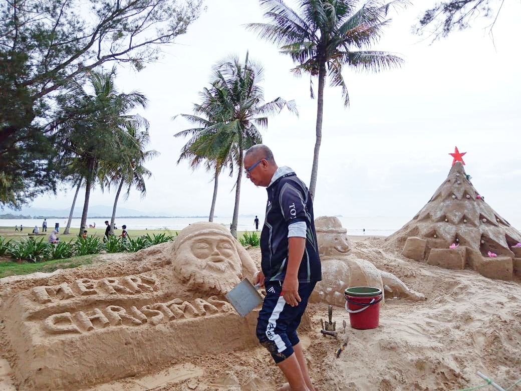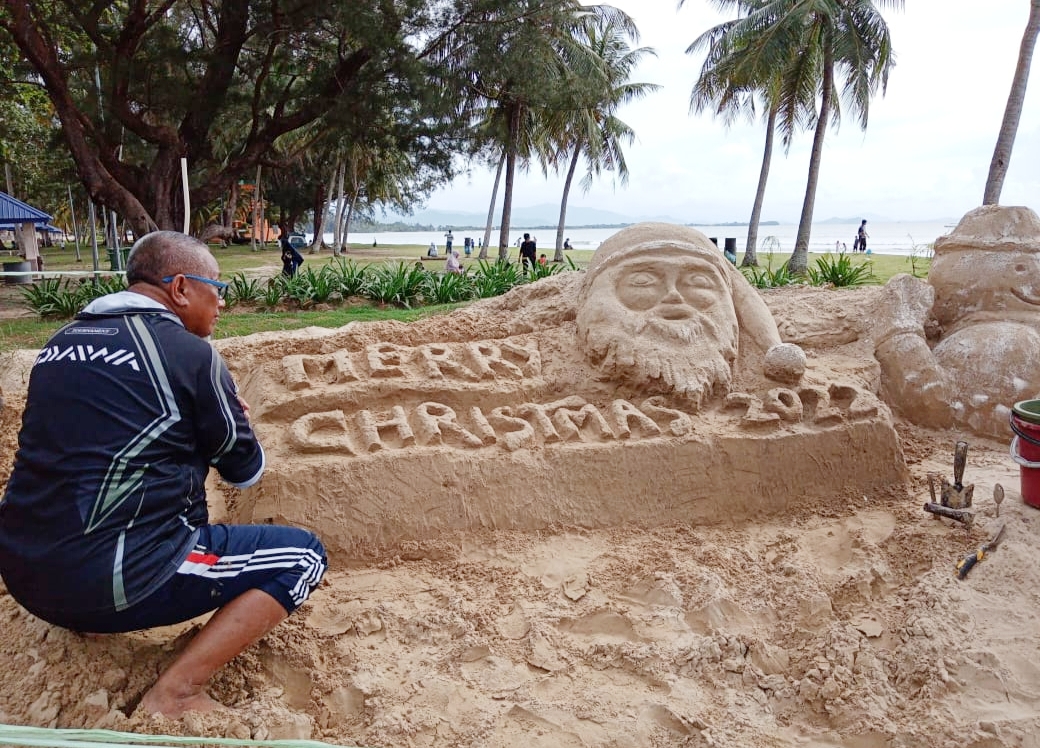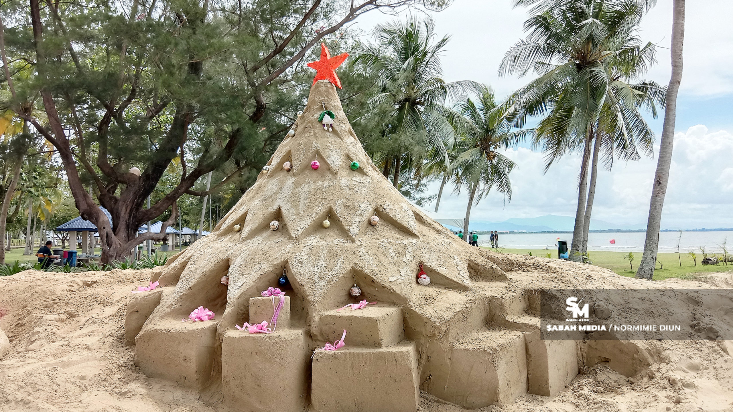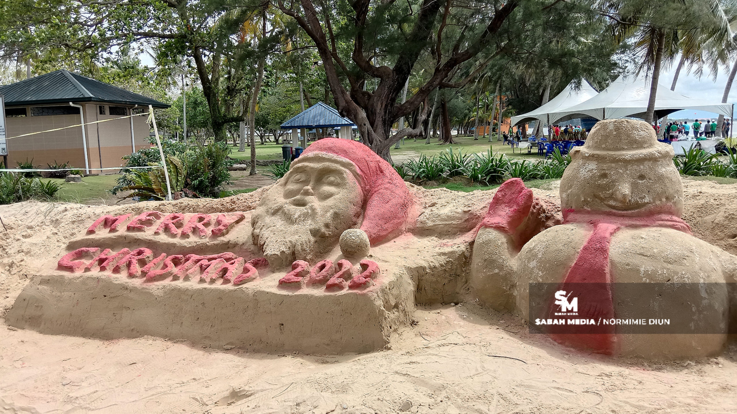 KOTA KINABALU: Sebuah arca pasir dibina berkonsepkan perayaan Hari Natal mencuri tumpuan pengunjung yang datang beriadah di pesisir pantai Tanjung Aru dekat sini.