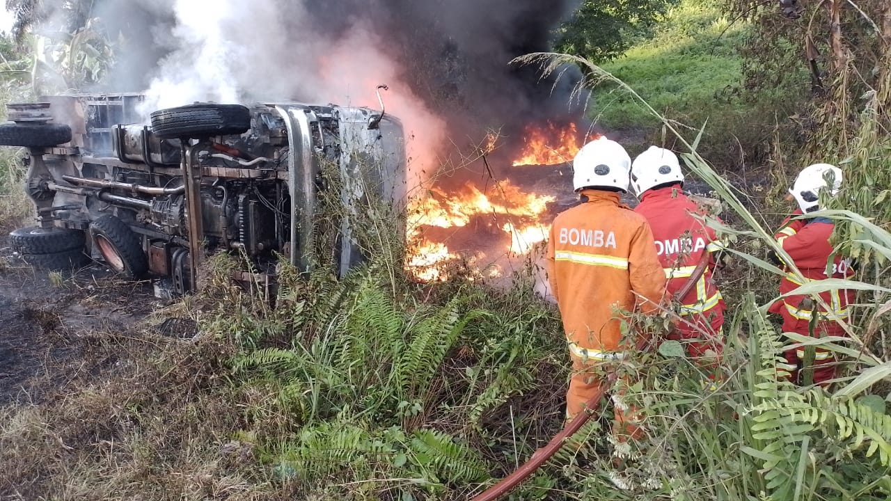 Katanya, sebaik tiba ditempat kejadian mendapati sebuah sebuah lori Isuzu Elf membawa muatan enam unit tong minyak diesel terbakar 100 peratus.