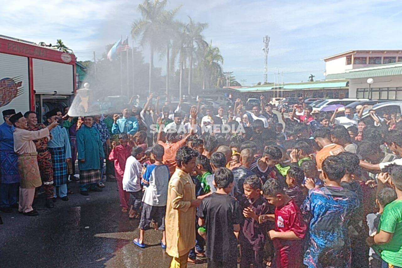 Terdahulu, para peserta yang terlibat sebelum itu telah ditepung tawar sebelum dimandikan secara beramai-ramai menggunakan hos yang disediakan Jabatan Bomba dan Penyelamat Malaysia (JBPM) Sabah. – SABAH MEDIA