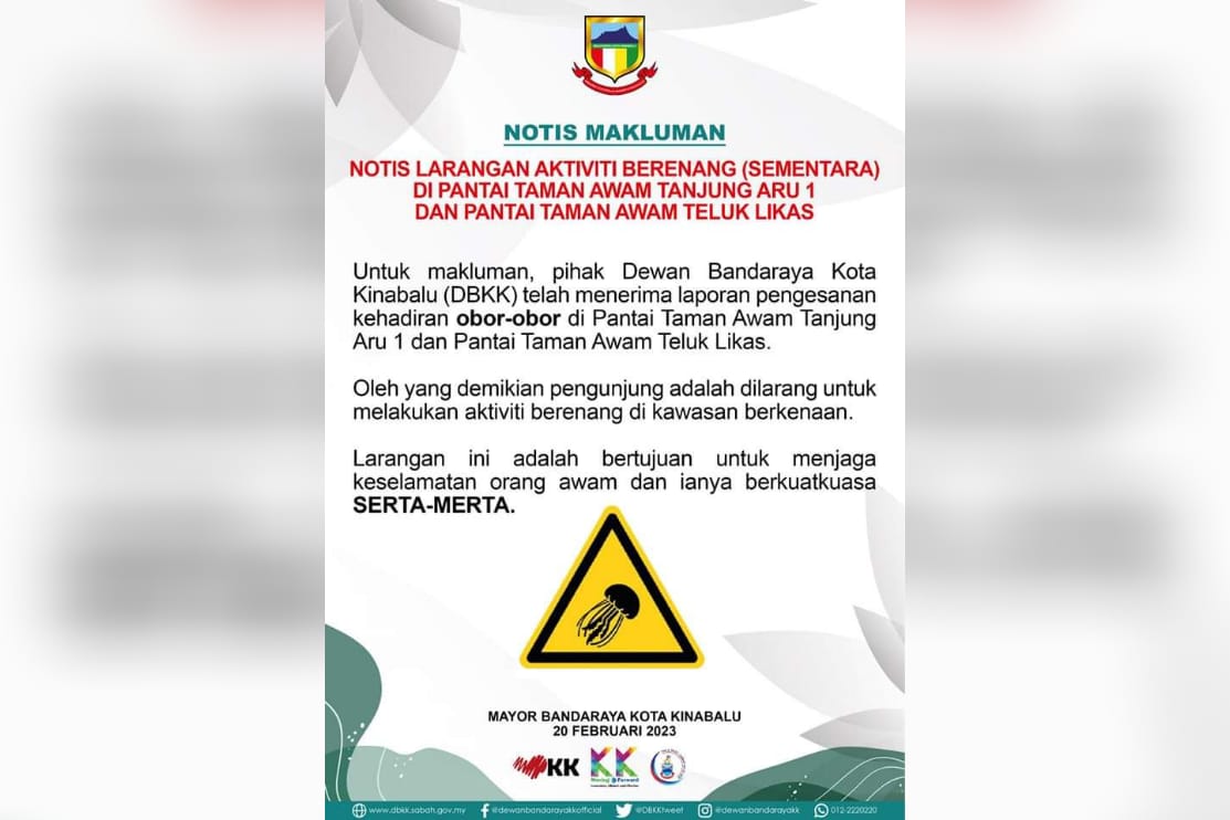 “Untuk makluman, pihak DBKK telah menerima laporan pengesanan kehadiran obor-obor di Pantai Taman Awam Tanjung Aru 1 dan Pantai Taman Awam Teluk Likas.
