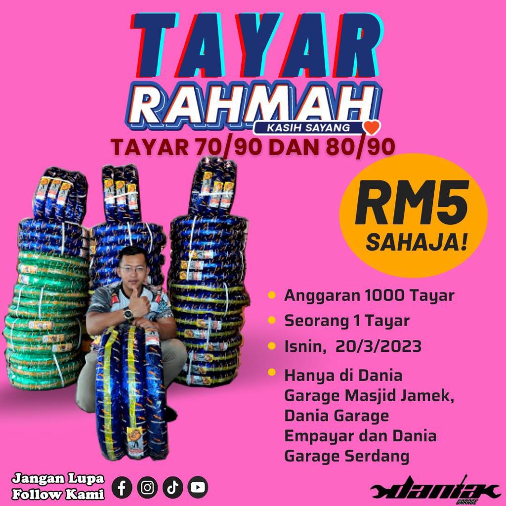 Menurut Mohd Mustakim, program jualan amal ini merupakan jualan tayar motosikal bersaiz 70/90-17 serta 80/90-17, harga jualan sebenar tayar tersebut adalah RM60 seunit yang mana harga Rahmah tayar itu tidak ada dijual di mana-mana tempat, setakat ini hanya di bengkel Dania Garage sahaja.