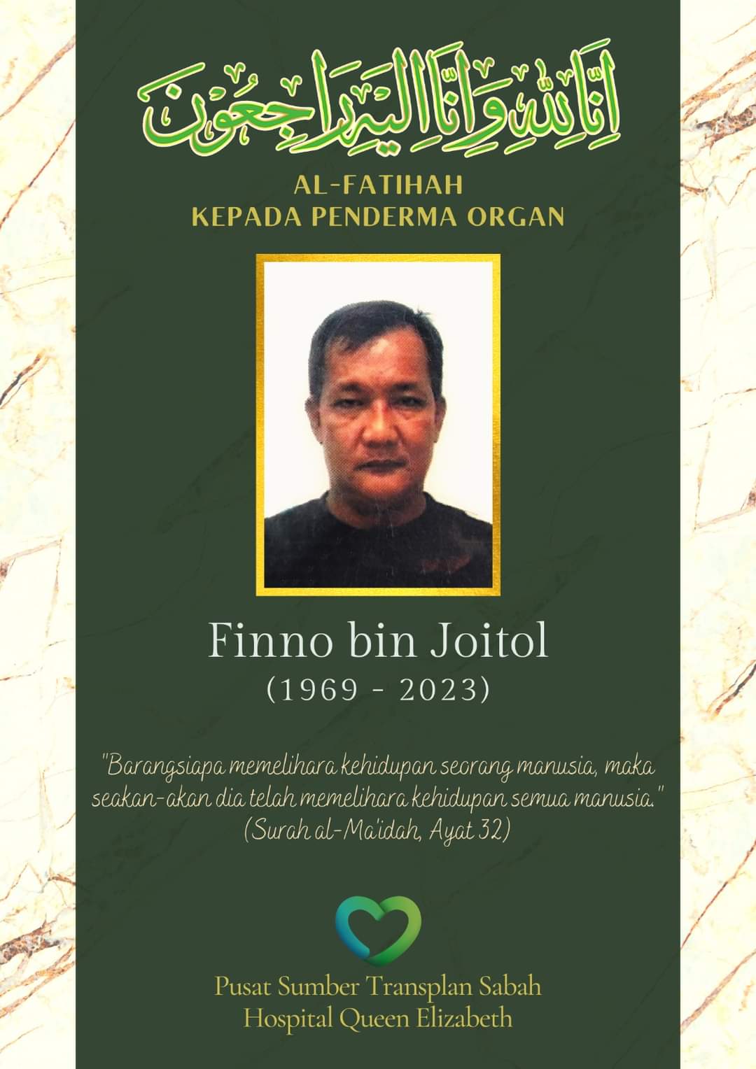 Penderma terbabit, Allahyarham Finno Joitol, 54, yang disahkan meninggal dunia di Hospital Queen Elizabeth (HQE), di sini adalah penderma organ yang ketiga di Sabah pada tahun ini.
