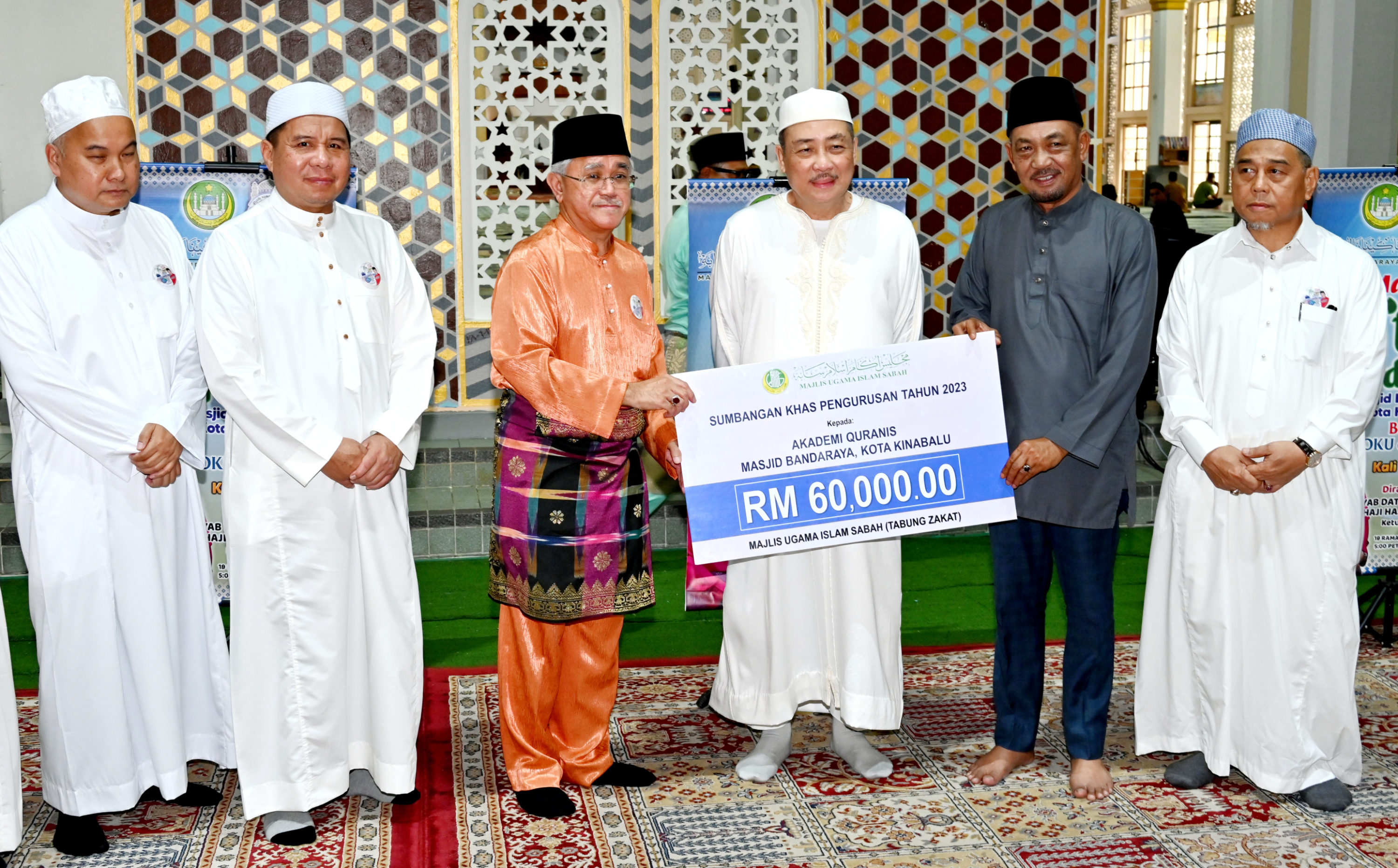 Hajiji turut menyaksikan penyerahan sumbangan sebanyak RM60 ribu daripada Bahagian Zakat dan Fitra Majlis Ugama Islam Sabah (MUIS) kepada Akademi Quranis MBR.