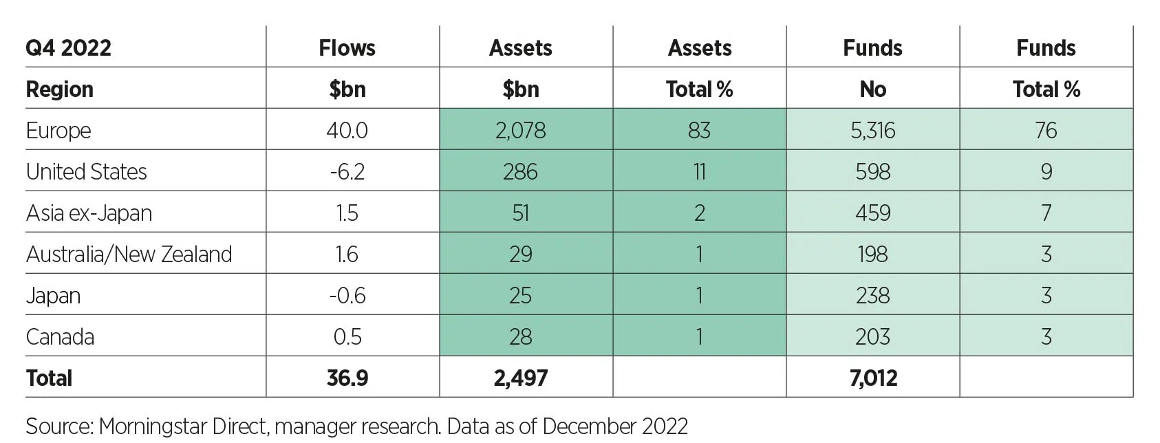 Penerimaan pelaburan ESG di Eropah kekal sama pada tahun 2022 berbanding dengan tahun 2021, dan Amerika Utara telah melihat momentum penggunaan nilai ESG untuk bersaing dengan Eropah dan secara global, dengan keluaran dana Amerika Utara pada tahun 2022.
