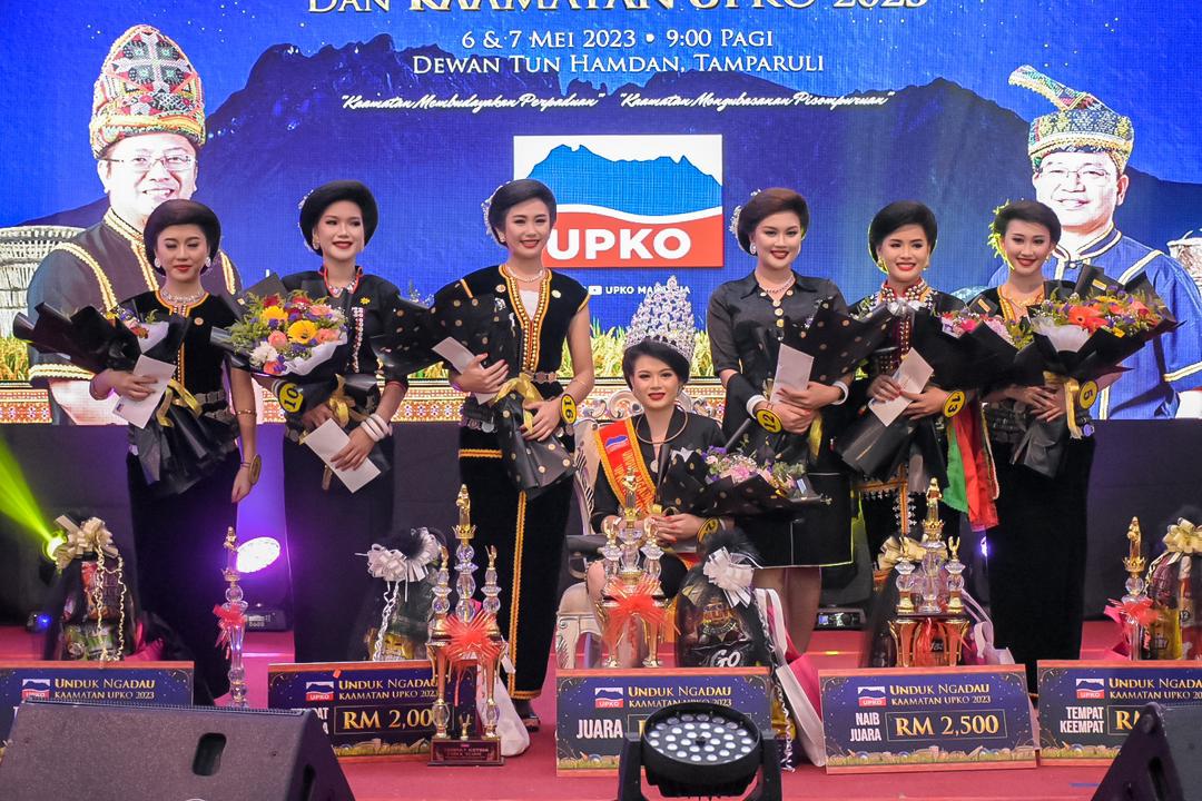 Tamparuli : Annette Rabecca Januin @ Abdon,24, yang mewakili UPKO Bahagian Wilayah Persekutuan Labuan dinobatkan sebagai juara Unduk Ngadau UPKO 2023 seterusnya menewaskan 21 peserta lain pada pertandingan akhir Unduk Ngadau Kaamatan UPKO, di Dewan Tun Hamdan Tamparuli, di sini, hari ini.