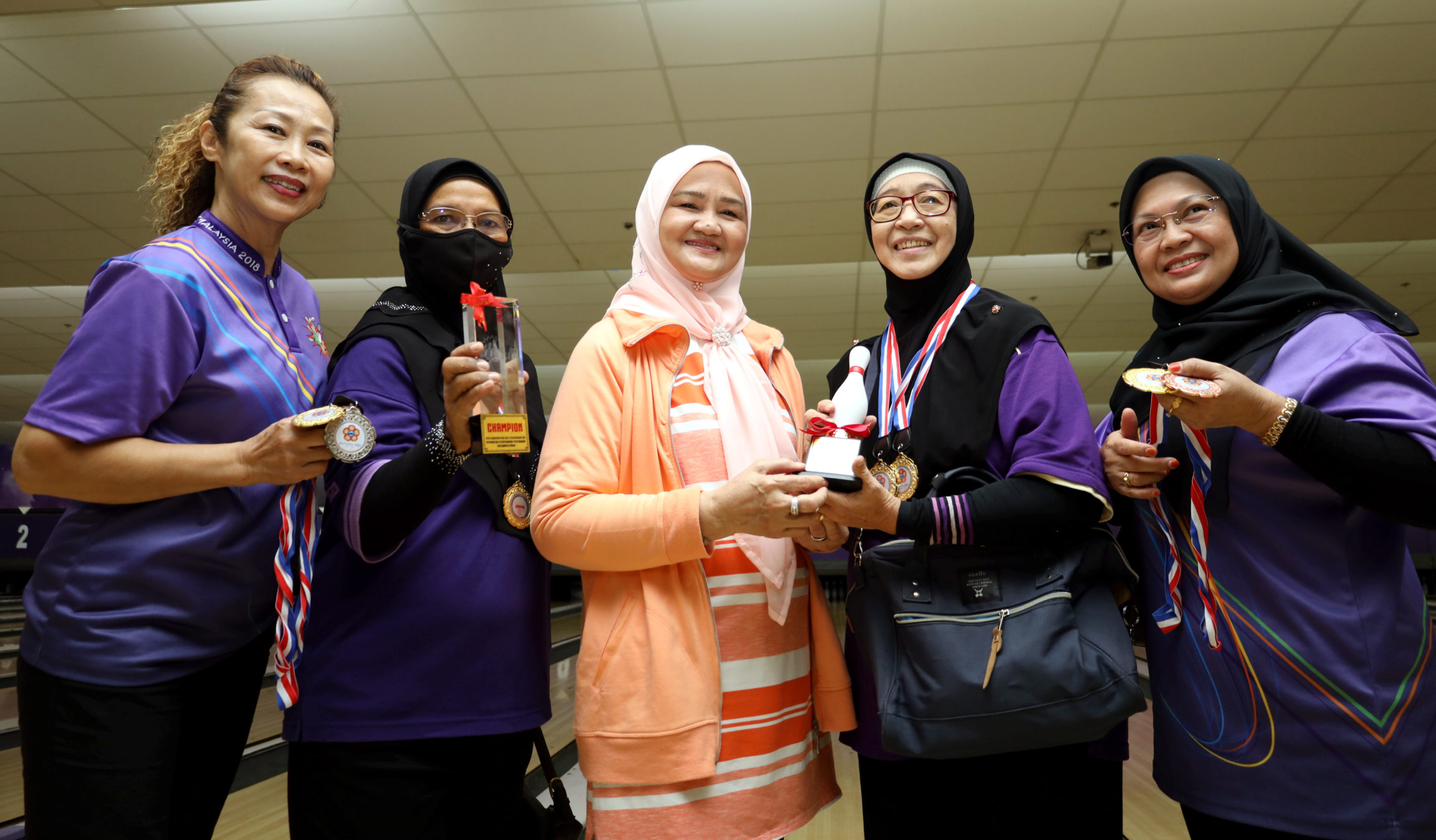 Yang Dipertua Pertubuhan Muafakat Titipan Amal Isteri Wakil Rakyat, Gabungan Rakyat Sabah (MUTIARA GRS), Datin Seri Panglima Datuk Hajah Juliah Salag, yang juga isteri Ketua Menteri bersama pasukan daripada Persatuan Suri dan Anggota Wanita Perkhidmatan Awam (PUSPANITA) Cawangan Sabah yang menjuarai perlawanan persahabatan tenpin boling Ahli MUTIARA GRS dan badan bukan kerajaan (NGO) wanita Sabah di Galaxy Bowl, Centre Point, pada Selasa.