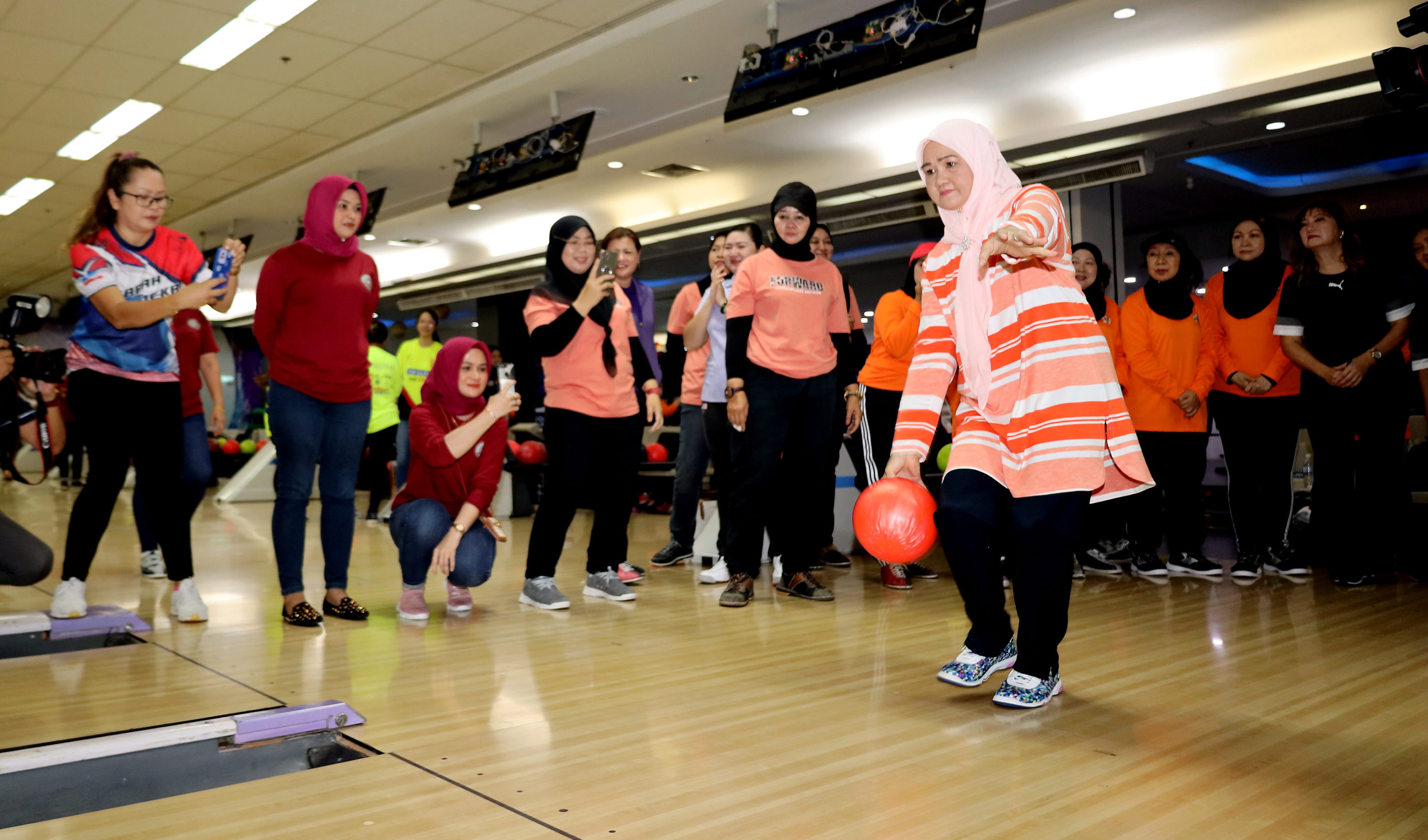 Yang Dipertua Pertubuhan Muafakat Titipan Amal Isteri Wakil Rakyat, Gabungan Rakyat Sabah (MUTIARA GRS), Datin Seri Panglima Datuk Hajah Juliah Salag melakukan balingan mula permainan tenpin boling sebagai tanda perasmian perlawanan persahabatan Ahli MUTIARA GRS dan badan bukan kerajaan (NGO) wanita Sabah di Galaxy Bowl, Centre Point, pada Selasa. – Foto ihsan JKM Sabah
