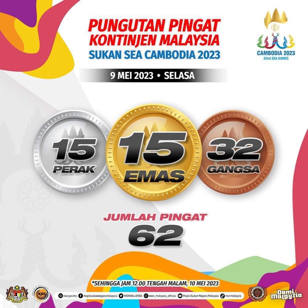 Vietnam kekal di kedudukan kedua selepas mengutip 39 pingat emas, 39 perak dan 46 gangsa manakala tuan rumah, Kemboja yang sebelum ini berada di tempat teratas jatuh dua anak tangga di posisi ketiga dengan 39-39-39.- BERNAMA