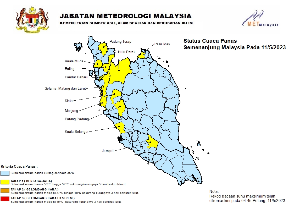 Kota Kinabalu : Jabatan Meteorologi Malaysia (MetMalaysia) hari ini mengeluarkan amaran cuaca panas tahap satu (berjaga-jaga) di tujuh negeri.