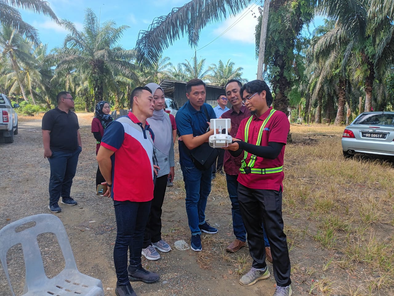 Perjumpaan ini melibatkan demonstrasi dron di ladang kelapa sawit serta pembentangan Model Pertanian Pintar di pejabat EM Drone Services Sdn Bhd.